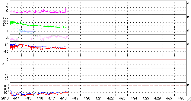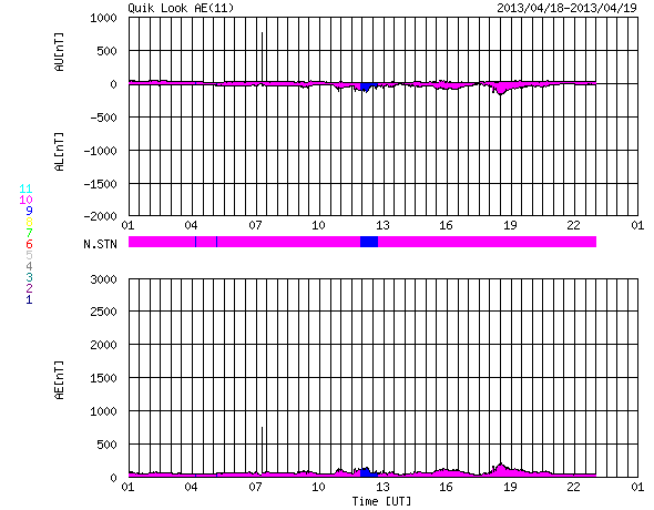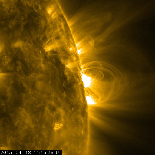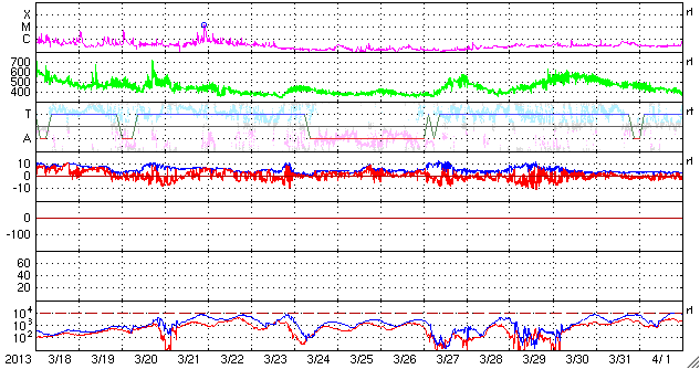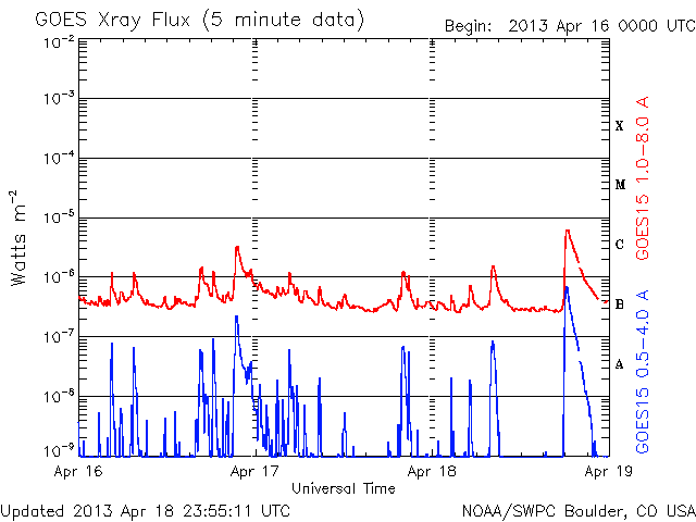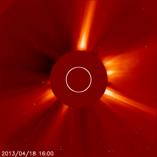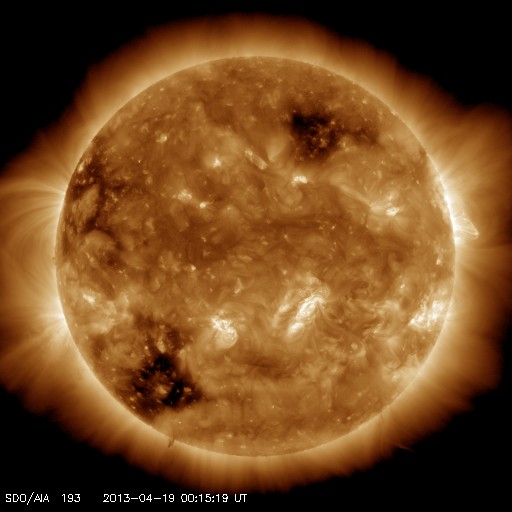 2013/ 4/19 09:23 更新 C6.5のフレアが発生し、太陽の西に向かってCMEが噴出しています。太陽風は低速です。 担当 篠原 太陽の西の端の1719黒点群で、未明の19日3時(世界時18日18時)に C6.5と大きめの小規模フレアが発生しました。 SDO衛星AIA171による動画をご覧ください。 フレア発生後に、ポスト・フレアループがとてもきれいに輝いています。 GOES衛星のX線グラフによると、長時間変化が続くタイプのフレアです。 この変化の時はCMEを伴っていることが多いので、 SOHO衛星LASCO C2カメラに注目すると、 太陽の右に向かって勢い良くコロナの噴出が発生していました。 横へ向かっているので、地球への影響はないでしょう。 1719黒点群は西に没してしまいました。 残った1723群は縮小傾向で、太陽の活動はこの後は穏やかになりそうです。 太陽風は、速度がもう一段下がって、280km/秒とかなり遅い風になっています。 27日前の前周期も穏やかな風だったのですが、400km/秒前後に留まっていました。 しかし、今回はそれ以上に静かな太陽風になっています。 磁場強度は、4nT前後と平均的な状態です。 南北成分は0nT付近に留まり、磁気圏も概ね静穏です。 太陽風はこの後も穏やかに推移しそうで、磁気圏も静かな状態が続きそうです。 ![]() SDO衛星AIA171による、西端で発生したC6.5のフレアの様子。 (c) SDO (NASA)、 (動画加工 : 宇宙天気ニュース) ![]() SOHO衛星LASCO C2カメラによる、太陽の西へ向って噴出するCME。 (c) SOHO (ESA & NASA)、 (動画加工 : 宇宙天気ニュース) ![]() SDO衛星のAIA193カメラによる太陽コロナの様子 (c) SDO (NASA) ![]() SDO衛星による太陽の可視光写真。マウスの矢印を写真に重ねると、黒点番号付きの写真に切り替わります。 (c) SDO (NASA) ![]() GOES衛星の太陽X線データ (c) NOAA/SWPC ![]() ACEが観測した太陽風の磁場(1番上の枠、白線は全体の強度、赤線は南北成分) および、太陽風の密度(3番目の橙線)、速度(4番目の黄線) (c) NOAA/SWPC ![]() リアルタイムAE指数 下段のAEグラフの値が高くなると、オーロラ活動が活発化しています。 (c) 京都大学, NICT ![]() 27日の太陽周期に合わせたデータプロット 太陽が同じ面を地球に向けていた27日前の変化から、今後を予想することができます。 (c) 作図:宇宙天気ニュース