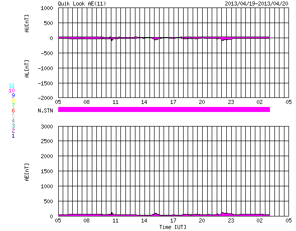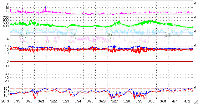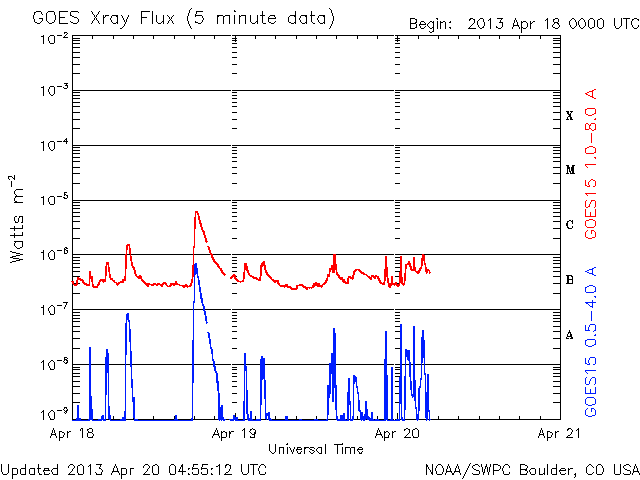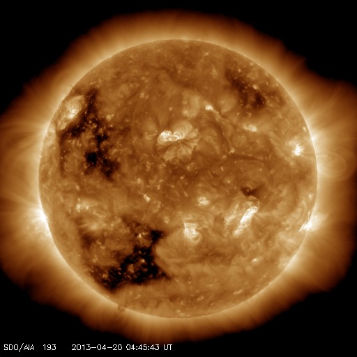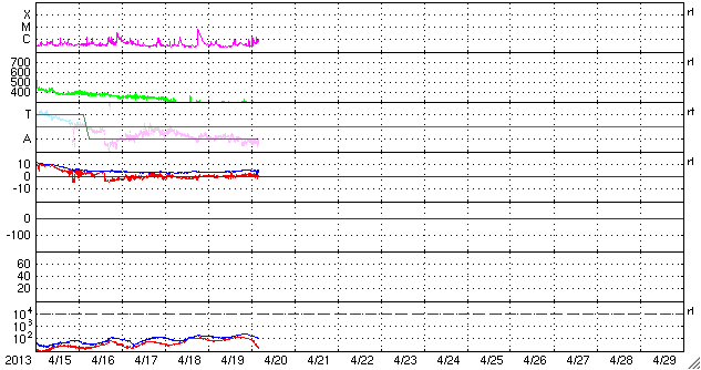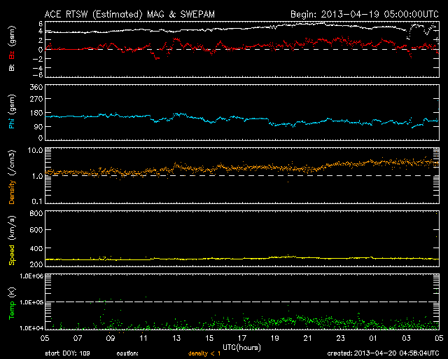 2013/ 4/20 13:58 更新 黒点群が2つ出現しています。太陽風は低速で安定しています。 担当 篠原 太陽の北半球の中央に1726黒点群、 東の端に1727黒点群と、 2カ所に黒点が急に出現しました。 昨日の太陽写真と比べると、 急に変わっているので驚きます。 フレアは、今のところC1の小さな活動が起きている程度です。 2つの群の今後の発達や、活動に注目して下さい。 太陽風は、280km/秒とかなり遅い風が続いています。 磁場強度は、4〜5nTと平均的な値で落ち着いています。 南北成分は比較的北寄りで、磁気圏は静かです。 AE指数はほとんど変化していません。 SDO影響AIA193を見ると、 太陽の東半球には、 北にも南にも広くコロナホールが広がっています。 南側がちょうど太陽の中央に達する頃ですが、 3〜4日後以降、これらの領域の影響で、 太陽風の速度が高まっていくかもしれません。 コロナホールの見え方は、27日前とかなり変わっています。 前の周期にも速度の高まりが来ましたが、 今回も更に高い速度の変化が到来するかもしれません。 ![]() SDO衛星のAIA193カメラによる太陽コロナの様子 (c) SDO (NASA) ![]() SDO衛星による太陽の可視光写真。マウスの矢印を写真に重ねると、黒点番号付きの写真に切り替わります。 (c) SDO (NASA) ![]() GOES衛星の太陽X線データ (c) NOAA/SWPC ![]() ACEが観測した太陽風の磁場(1番上の枠、白線は全体の強度、赤線は南北成分) および、太陽風の密度(3番目の橙線)、速度(4番目の黄線) (c) NOAA/SWPC ![]() リアルタイムAE指数 下段のAEグラフの値が高くなると、オーロラ活動が活発化しています。 (c) 京都大学, NICT ![]() 27日の太陽周期に合わせたデータプロット 太陽が同じ面を地球に向けていた27日前の変化から、今後を予想することができます。 (c) 作図:宇宙天気ニュース