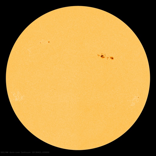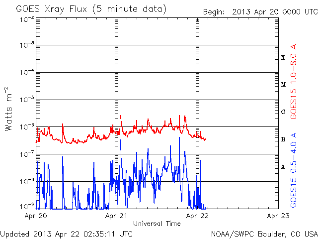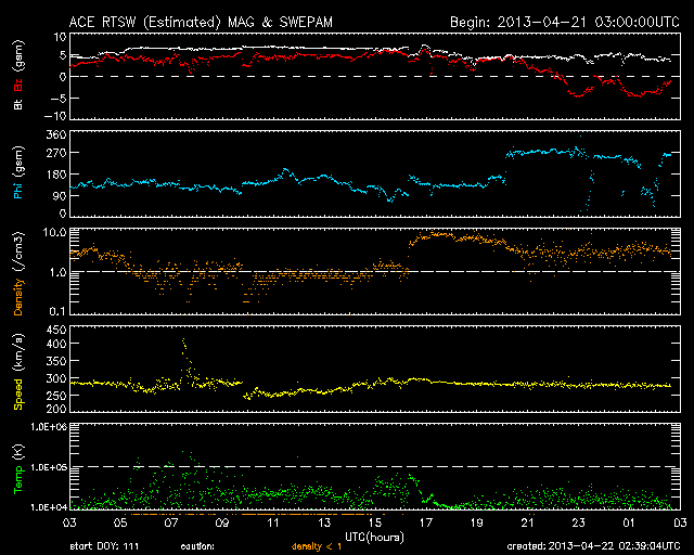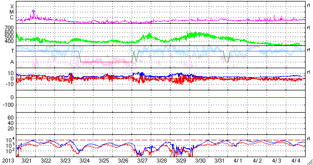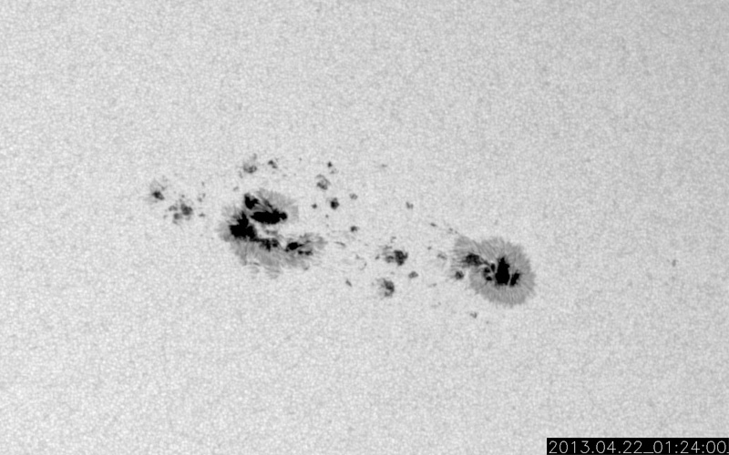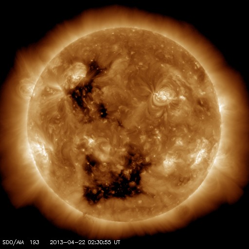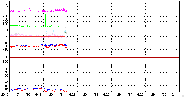 2013/ 4/22 11:40 更新 1726黒点群がCクラスフレアを頻繁に起こしています。太陽風はとても低速です。 担当 篠原 1726黒点群は更に姿が変化し、フレアも活発に起こしています。 昨日のニュース以降、C4.5を最大として、 C1以上のフレアが回程度発生しています。 SDO衛星による拡大写真を掲載します。 南西の1723黒点群でもフレアが起きていて、 GOES衛星のX線カメラの動画を見ていると、 両者でチカチカとフレアが続いている様子が分かります。 黒点群の磁場構造は「βγδ」に分類されていて、 より大きなエネルギーを蓄えていると考えられます。 今後、MクラスやXクラスのフレアを起こす可能性もあります。 太陽風は、280km/秒とかなり遅い状態で安定しています。 磁場強度は、7nTに少し上がりましたが、 やがて5nTと平均的な値に戻りました。 磁気圏も静かで、AE指数は全く変化していません。 SDO衛星AIA193の太陽コロナの写真では、 南半球と北半球それぞれに大きなコロナホールがあります。 1月以降の変化を見るため、27日毎の写真を動画にしました。 先月までは、細い筋のようなコロナホールが見えていただけですが、 今回、一気に大きく広がっています。 明後日、24日くらいから、太陽風に影響が現れそうです。 1726黒点群は、日食グラスを使うと、 なんとか肉眼で見ることができました(と思います)。 3倍ほどの倍率がある太陽観察オペラグラスだともっと簡単に見えます。 どちらも金環日食観察用に買ったものですが、今でも活躍しています。 日食グラスなどをお持ちであれば、挑戦してみてはいかがでしょうか。