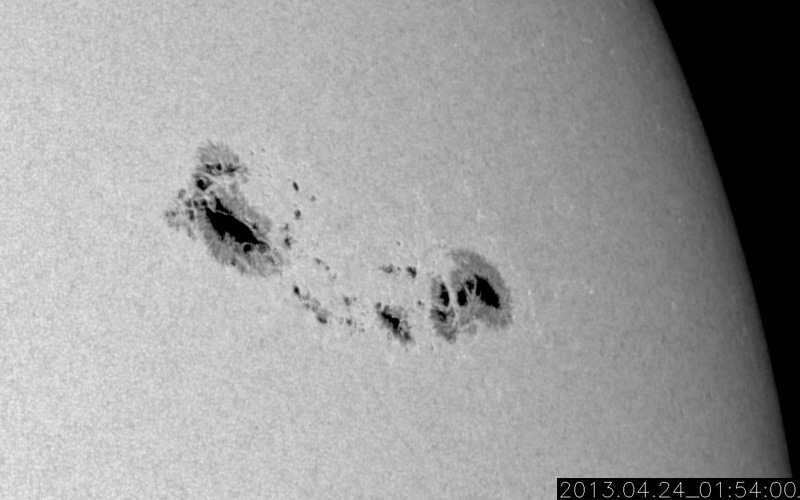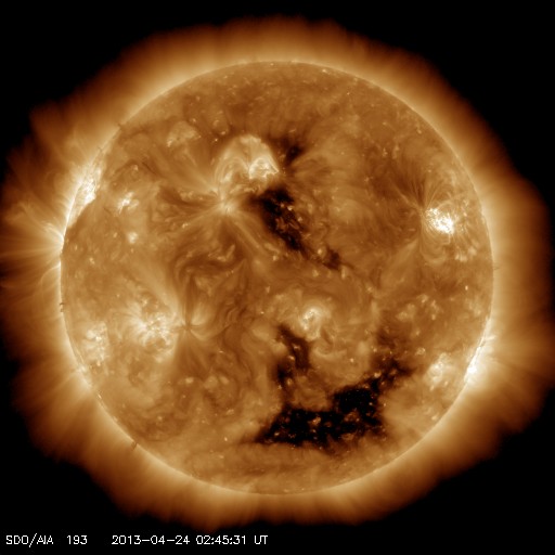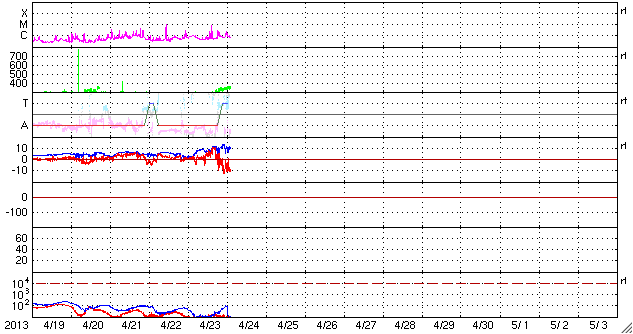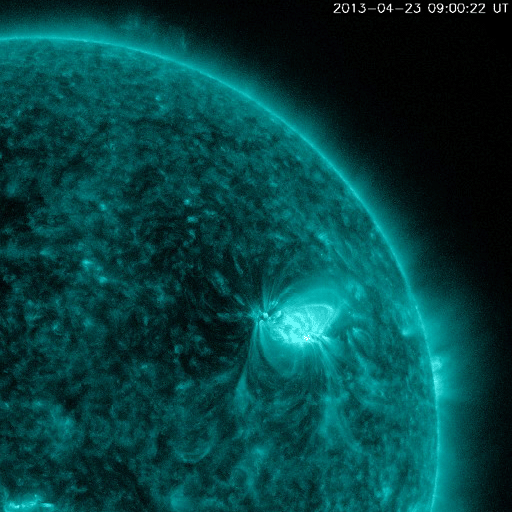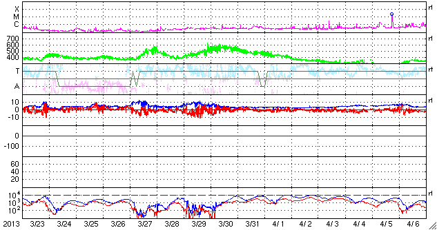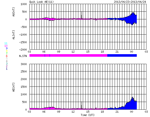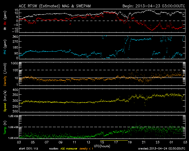 2013/ 4/24 11:51 更新 太陽風の磁場強度が高まり、南向きに大きく振れています。1726黒点群でC8.2のフレアが発生しました。 担当 篠原 昨日のニュースの直後から、太陽風の磁場が強まり始め、 10nT前後で推移するようになりました。 一方、速度の変化は小さく、300km/秒と低速のままで安定し、 今朝になって350km/秒にやや上がった程度です。 依然、低速風が続いています。 地球の磁気圏への影響度を決める磁場の南北成分は、 磁場が強まるとともに大きく振れるようになりました。 初めは北向きに強まっていたのですが、 今朝くらいから南向きに切り替わり、 現在、-10nTと大きく南に振れた状態が5時間ほど続いています。 このため、磁気圏の活動度も高まっているようで、 AE指数は700nT程度の変化が発生し、 Dst指数も下がる気配を見せています。 今のところ太陽風の速度が遅いので、 磁気圏の活動は激しいという規模ではありませんが、 大きく広がったコロナホールの影響がどの程度及ぶかという要素と合わせて、 今後の太陽風の変化に注目してください。 1726黒点群で、昨夜、23日23時(世界時23日14時)に、 C8.2と大きめの小規模フレアが発生しました。 昨日のM1.0を再現したかの様なフレアで、 SDO衛星AIA131による動画を掲載します。 1726黒点群では、その後もC1〜2のフレアが7回程度発生しています。 活動的な状態は続いていますが、次第に西の端に近付いてきました。 SDO衛星による1726黒点群の拡大写真を掲載しますが、 太陽の端が写真に入るようになっています。 ![]() SDO衛星の可視光写真による、巨大な1726黒点群。 (c) SDO (NASA) ![]() SDO衛星AIA131による、1726黒点群で発生したC8.2フレアなど。 (c) SDO (NASA)、 (動画加工 : 宇宙天気ニュース) ![]() SDO衛星のAIA193カメラによる太陽コロナの様子 (c) SDO (NASA) ![]() SDO衛星による太陽の可視光写真。マウスの矢印を写真に重ねると、黒点番号付きの写真に切り替わります。 (c) SDO (NASA) ![]() ACEが観測した太陽風の磁場(1番上の枠、白線は全体の強度、赤線は南北成分) および、太陽風の密度(3番目の橙線)、速度(4番目の黄線) (c) NOAA/SWPC ![]() リアルタイムAE指数 下段のAEグラフの値が高くなると、オーロラ活動が活発化しています。 (c) 京都大学, NICT ![]() 27日の太陽周期に合わせたデータプロット 太陽が同じ面を地球に向けていた27日前の変化から、今後を予想することができます。 (c) 作図:宇宙天気ニュース