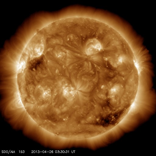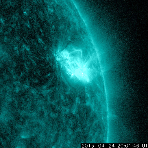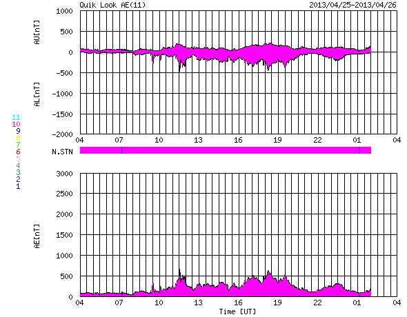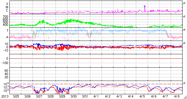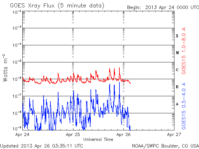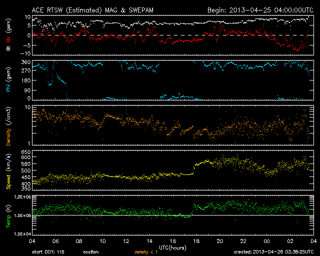 2013/ 4/26 12:32 更新 1726黒点群でC5のフレアが3回発生しました。太陽風は500km/秒台の高速風になっています。 担当 篠原 1726黒点群で、Cクラスのフレアが続いています。 特に今日の未明、26日2時半(世界時25日17時半)から、 C5.6、C5.8、C5.7と、C5のフレアが2時間おきに発生してます。 GOES衛星のX線グラフを見ると、 グラフの最後にまとまった3つの山が発生しています。 この1日半ほどの活動的な様子を、 SDO衛星AIA193の拡大写真の動画で紹介します。 黒点群のあちこちで、次々に輝きが発生していてきれいです。 1726黒点群はこの後太陽の裏側に回ります。 地球への影響はなくなりますが、 どの様な活動が続くのか興味は残ります。 太陽風は、26日3時(世界時26日18時)頃に、 450km/秒から550km/秒へ速度が上がり、高速の状態に変わっています。 現在も500〜550km/秒の間を変化しています。 磁場強度は、7〜8nTとやや強まった状態です。 南北成分は、南と北の両方に振れていて、 磁気圏ではAE指数300〜500nT程度の小規模の活動が続いています。 これから2日程度、太陽風は速度が高めになりそうです。