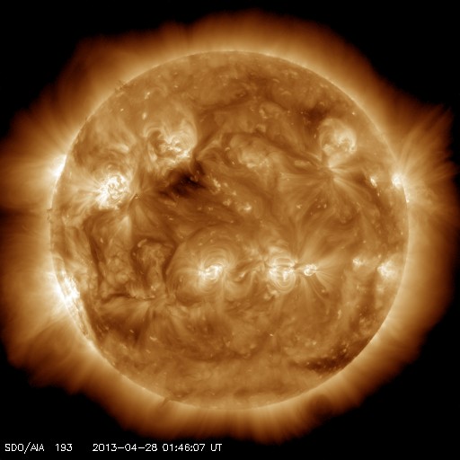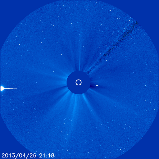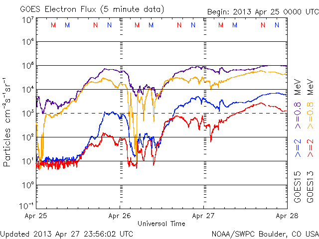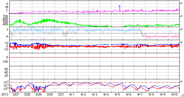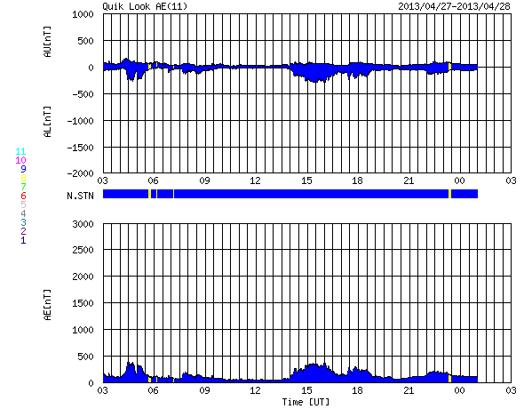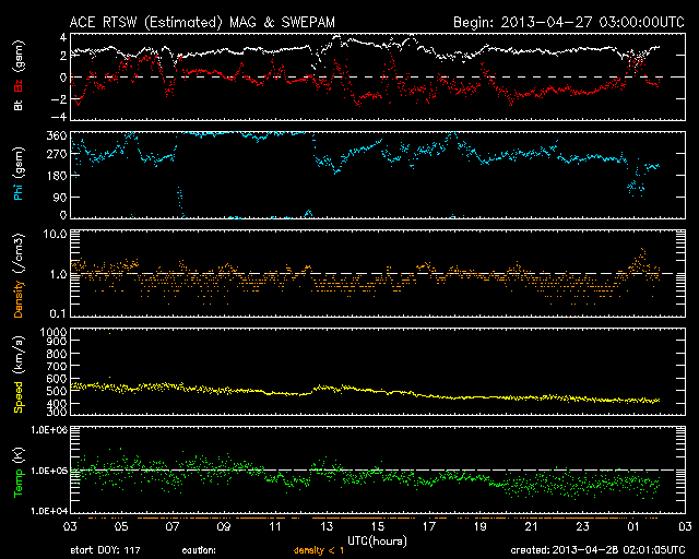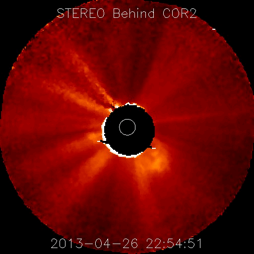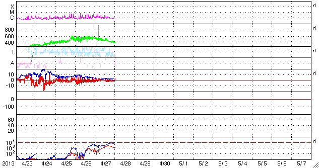 2013/ 4/28 11:01 更新 昨日のフィラメント噴出によりCMEが発生しています。高速の太陽風は終わりました。 担当 篠原 昨日のニュースで紹介した太陽のフィラメント噴出によるCMEの様子を、 SOHO衛星LASCO C3カメラと、 STEREO Behind衛星COR2カメラの動画で紹介します。 SOHOの動画では、太陽の下に向かって白いガスが広がって行きます。 同時に右にも噴き出しているCMEがありますが、 これは太陽の裏側で発生した現象の様です。 STEREO Behind衛星で太陽の斜め向こうから観測すると、 地球側で発生したCMEが右下に、反対側で発生したCMEが左側に それぞれ違う方向に飛び出しています。 CMEはかなり南向きに偏って噴き出していて、 地球方向への噴き出しは弱いようです。 どの程度の影響がやって来るのか、 30日から5月1日くらいの太陽風の変化に注目してください。 太陽では、活発に活動していた1726黒点群が、 西の端に没して見えなくなってしまいました。 それとともに、X線グラフの変動も小さくなっています。 残った黒点群では、北東の1731黒点群と南東端の1732黒点群で、 それぞれC1の小さなフレアが発生しています。 今後はこの辺りの活動に注目してください。 太陽風は、ゆっくりと速度が下がり、 既に420km/秒と高速状態は終わっています。 磁場強度も3nT前後と弱めの状態です。 太陽風の強まりは2日程度で終わりました。 27日周期の図で前周期と比較すると、前半の速度の山はなくなり、 後半の高まりも期間が短くなっています。 コロナホールは大きくなっていたのですが、 地球への影響は弱まっています。 磁気圏では、AE指数で300nT程度の小規模の活動が度々発生しています。 太陽風が弱まってきたため、今後はより静かになりそうです。 放射線帯の高エネルギー電子は、昨日よりも増加していますが、 10,000のレベルには達していません。 増加はこのくらいで落ち着きそうです。