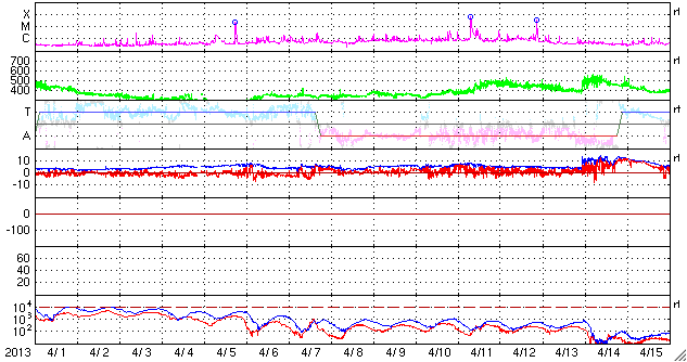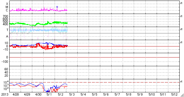- 2013/ 5/ 2 12:45 太陽風磁場の強い南向きが続いて、磁気圏の活動が高まりました。4月の黒点数は72に上がりました。
