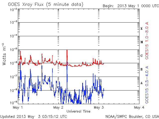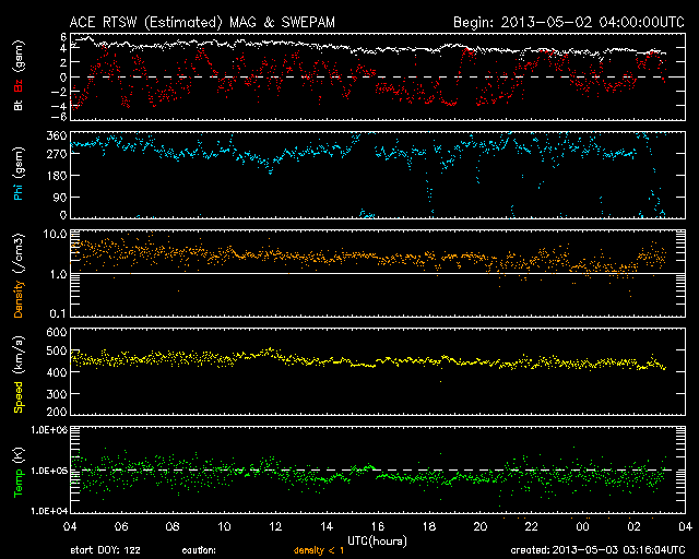 - 2013/ 5/ 1 11:43 太陽風の小規模の変動が到来しました。C9.6のフレアが発生しています。