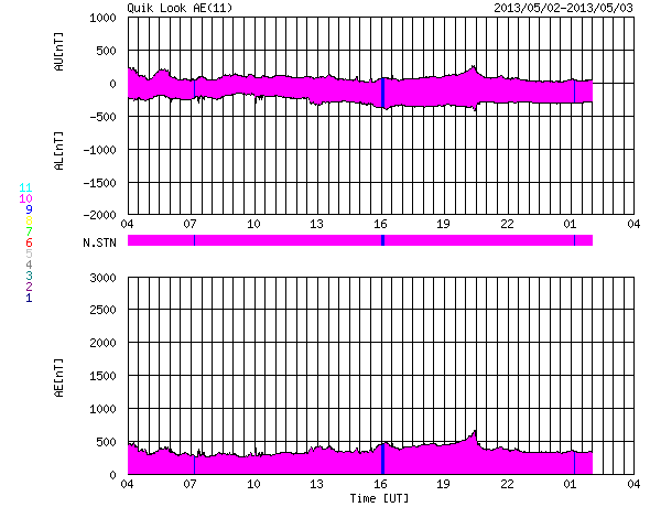 下段のAEグラフの値が高くなると、オーロラ活動が活発化しています。