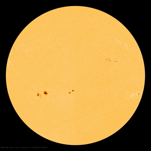 SDO衛星による太陽の可視光写真。マウスの矢印を写真に重ねると、黒点番号付きの写真に切り替わります。