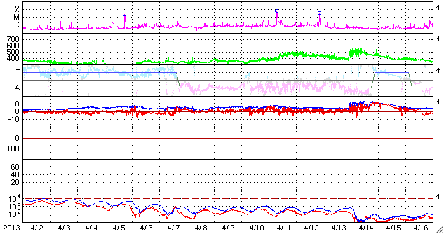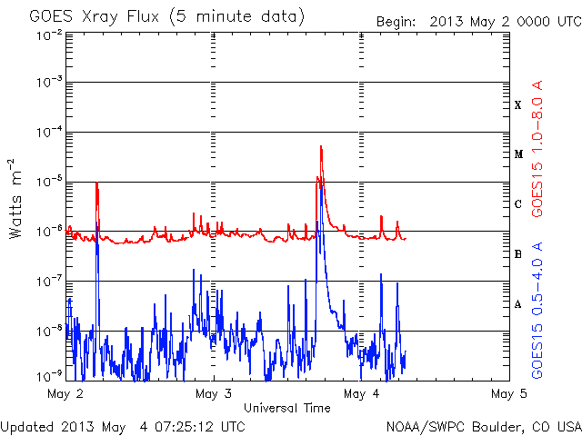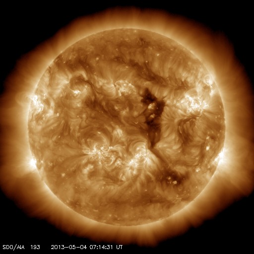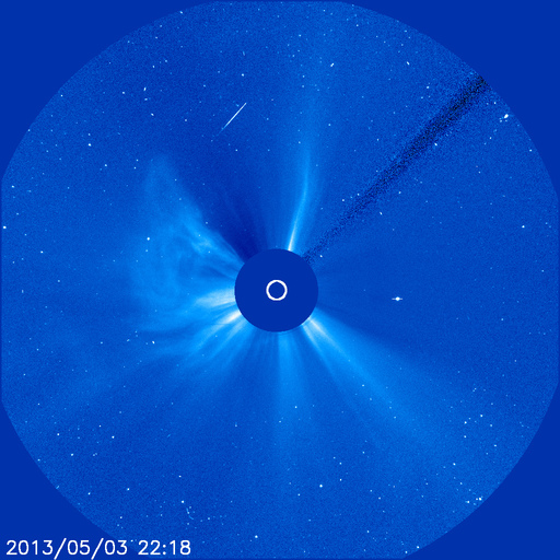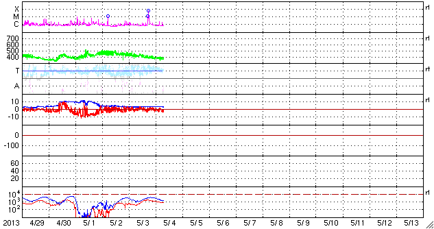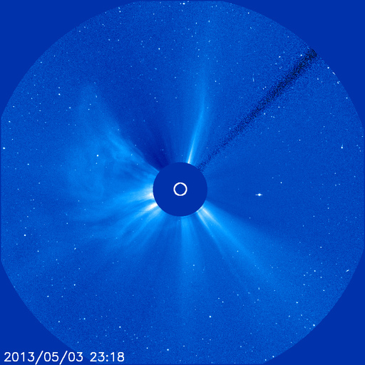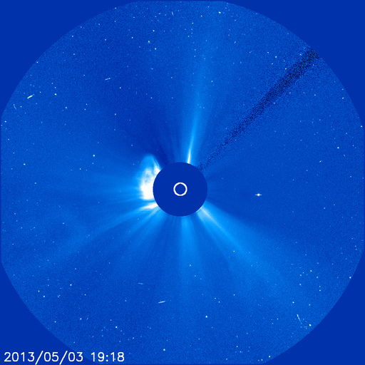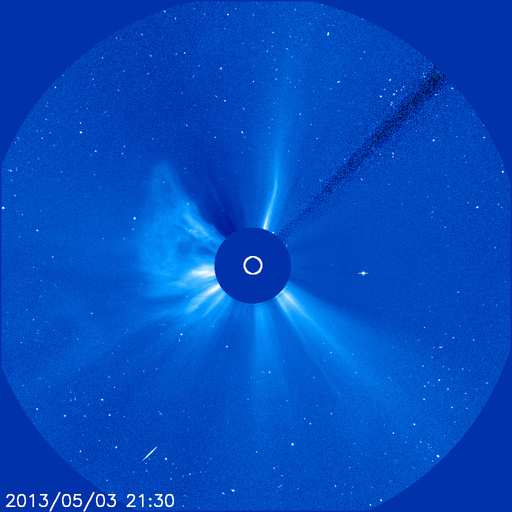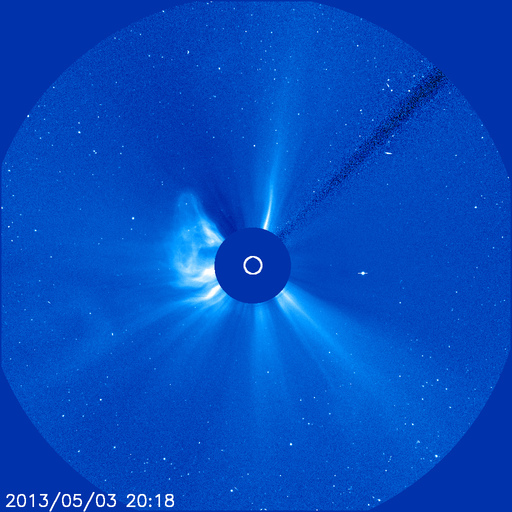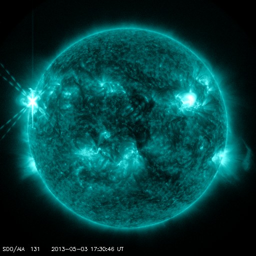 2013/ 5/ 4 16:28 更新 太陽の東端でM5.7の中規模フレアが発生しました。CMEも噴出しています。 担当 篠原 4日2時半(世界時3日17時半)に、 太陽の東端から現れた1739黒点群で、 M5.7の中規模フレアが発生しました。 SDO衛星の写真を掲載しますが、 ちょうど端で激しく輝いています。 SOHO衛星LASCO C3を見ると、 太陽の左に向かって CMEの白いガスが激しく噴出しています。 また、太陽ではこの直前の4日1時半(世界時3日16時半)にも、 北西部の1731黒点群で、 M1.1の中規模フレアが起きています。 活発なフレアの活動は今後も続く可能性があります。 1739黒点群の様子など注目して下さい。 太陽風は、速度370km/秒、磁場強度4nTと 穏やかです。 AE指数のグラフは、 昨日と同じくずっと太くなっていますが、 これはデータがおかしいようで、 磁気圏は比較的穏やかな状態だと思います。 太陽風は、このまま穏やかに推移するでしょう。 今日は、大きなイベントが発生したのに、 更新が遅くなり申し訳ありませんでした。 明日は動画なども掲載するつもりです。 ![]() SDO衛星による、太陽の東端で発生したM5.7の中規模フレア。 (c) SDO衛星 ![]() SOHO衛星 LASCO C3カメラの映像 (c) SOHO (ESA & NASA)