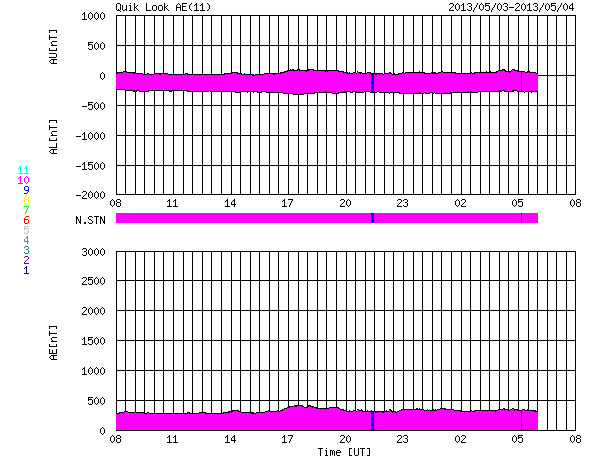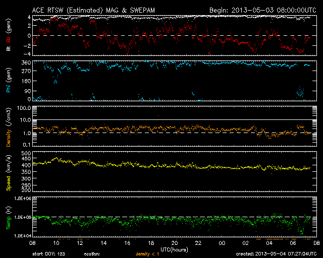SDO衛星のAIA193カメラによる太陽コロナの様子 (c) SDO (NASA) ![]() SDO衛星による太陽の可視光写真。マウスの矢印を写真に重ねると、黒点番号付きの写真に切り替わります。 (c) SDO (NASA) ![]() GOES衛星の太陽X線データ (c) NOAA/SWPC ![]() ACEが観測した太陽風の磁場(1番上の枠、白線は全体の強度、赤線は南北成分) および、太陽風の密度(3番目の橙線)、速度(4番目の黄線) (c) NOAA/SWPC ![]() リアルタイムAE指数 下段のAEグラフの値が高くなると、オーロラ活動が活発化しています。 (c) 京都大学, NICT ![]() 27日の太陽周期に合わせたデータプロット 太陽が同じ面を地球に向けていた27日前の変化から、今後を予想することができます。 (c) 作図:宇宙天気ニュース