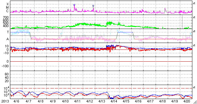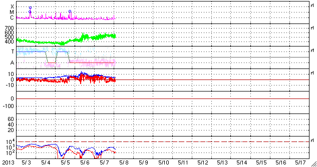 - 2013/ 5/ 6 11:19 M1.4の中規模フレアが発生しました。太陽風はやや高速になっています。