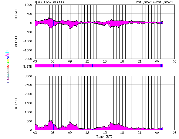 下段のAEグラフの値が高くなると、オーロラ活動が活発化しています。