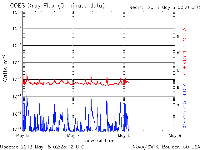 - 2013/ 5/ 7 12:05 フレアの発生は減少しています。太陽風は500km/秒の高速状態です。