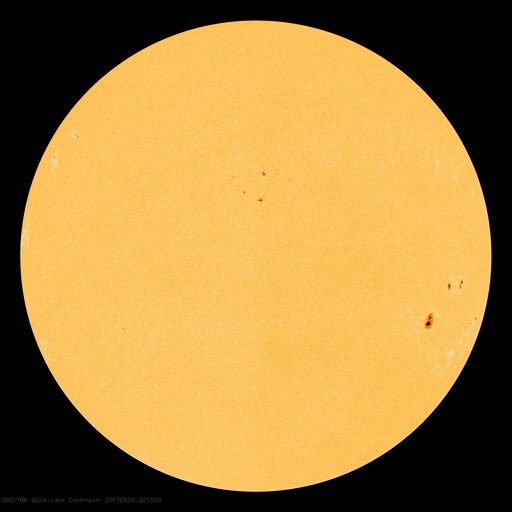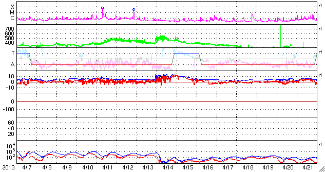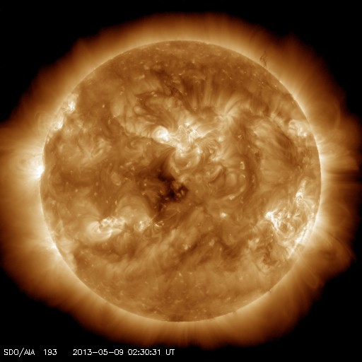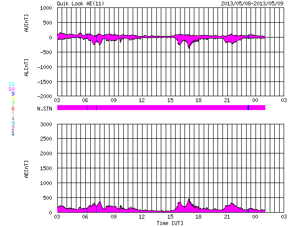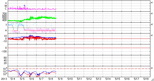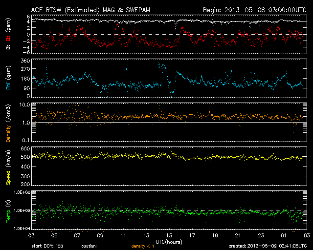 2013/ 5/ 9 11:42 更新 500km/秒の高速風が続いています。太陽の活動は弱まっています。 担当 篠原 太陽風は、500km/秒と高速の風が続いています。 磁場強度も、5〜4nTで安定していて、 太陽風は昨日からほとんど同じ状態です。 高速風は3日間続いていて、27日周期の図を見ると、 前周期よりもずいぶん高まった変化になっています。 磁気圏では、AE指数300〜400nTの小規模の変動が度々発生しています。 太陽風磁場の南北成分は、南寄りの変化を続けているので、 その影響が及んでいるのでしょう。 太陽風の高まりがどこまで続くのか、引き続き注目してください。 SDO衛星AIA193では、太陽の中心に小さいコロナホールが見えています。 この影響も3日後くらいにやって来るかもしれません。 太陽は、C1の小さなフレアが3回発生した程度で、 活動度は下がっている様です。 東の端から新しい黒点が姿を現しましたが、 どのような活動度の黒点群でしょうか。 ![]() SDO衛星のAIA193カメラによる太陽コロナの様子 (c) SDO (NASA) ![]() SDO衛星による太陽の可視光写真。マウスの矢印を写真に重ねると、黒点番号付きの写真に切り替わります。 (c) SDO (NASA) ![]() ACEが観測した太陽風の磁場(1番上の枠、白線は全体の強度、赤線は南北成分) および、太陽風の密度(3番目の橙線)、速度(4番目の黄線) (c) NOAA/SWPC ![]() リアルタイムAE指数 下段のAEグラフの値が高くなると、オーロラ活動が活発化しています。 (c) 京都大学, NICT ![]() 27日の太陽周期に合わせたデータプロット 太陽が同じ面を地球に向けていた27日前の変化から、今後を予想することができます。 (c) 作図:宇宙天気ニュース
