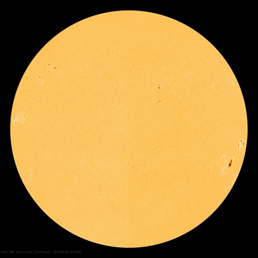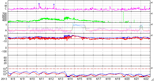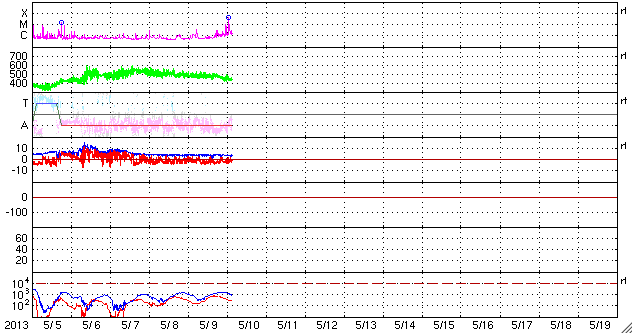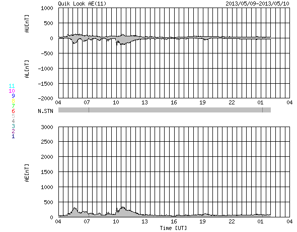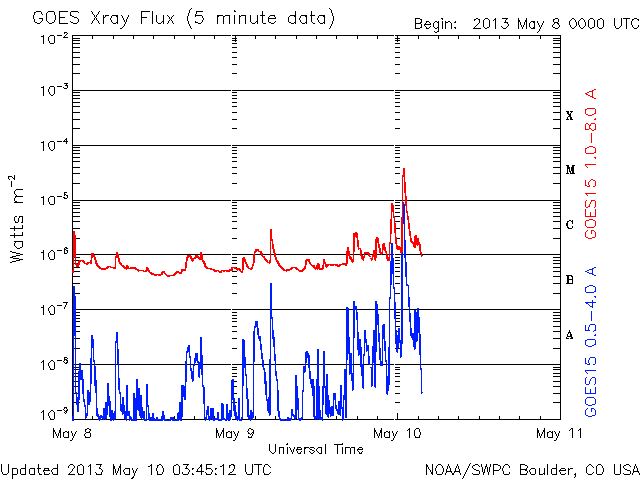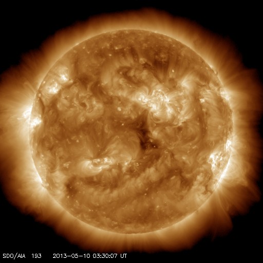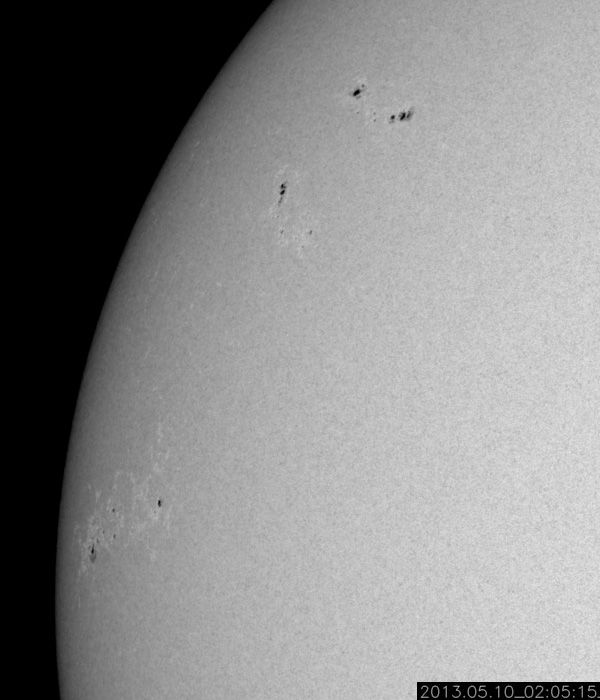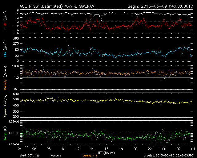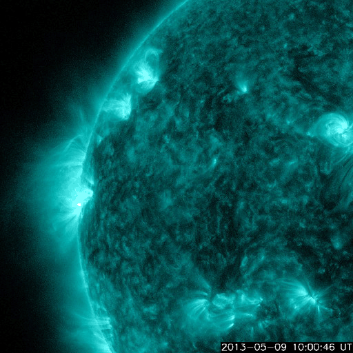 2013/ 5/10 12:49 更新 太陽の東端でM3.9の中規模フレアが発生しました。 担当 篠原 太陽の東端から現れた1744黒点群で、 今朝、10日10時(世界時10日1時)にM3.9の中規模フレアが発生しました。 SDO衛星AIA131による、フレア発生時の太陽の様子を動画で紹介します。 Mフレアのしばらく前から、 この領域で頻繁にフレアの輝きが発生しています。 SDO衛星の可視光の拡大写真を次に掲載します。 上から順に、1742、1743、1744と3つの黒点群が並んでいます。 これから、この領域でどのような活動が発生するのか注目してください。 太陽風は、速度がゆっくりと下がって、 440km/秒と高速風が終わろうとしています。 磁場強度も4nTから3nTに下がりそうな様子です。 太陽風は、高速の領域が終わりそうです。 磁気圏も概ね静穏で、 AE指数のグラフは前半に小規模の変化が見られる程度です。 ![]() SDO衛星AIA131による、1744黒点群で発生したM3.9フレア。 (c) SDO (NASA)、 (動画加工 : 宇宙天気ニュース) ![]() SDO衛星の可視光写真による、1742、1743、1744黒点群。 (c) SDO (NASA) ![]() SDO衛星のAIA193カメラによる太陽コロナの様子 (c) SDO (NASA) ![]() SDO衛星による太陽の可視光写真。マウスの矢印を写真に重ねると、黒点番号付きの写真に切り替わります。 (c) SDO (NASA) ![]() GOES衛星の太陽X線データ (c) NOAA/SWPC ![]() ACEが観測した太陽風の磁場(1番上の枠、白線は全体の強度、赤線は南北成分) および、太陽風の密度(3番目の橙線)、速度(4番目の黄線) (c) NOAA/SWPC ![]() リアルタイムAE指数 下段のAEグラフの値が高くなると、オーロラ活動が活発化しています。 (c) 京都大学, NICT ![]() 27日の太陽周期に合わせたデータプロット 太陽が同じ面を地球に向けていた27日前の変化から、今後を予想することができます。 (c) 作図:宇宙天気ニュース