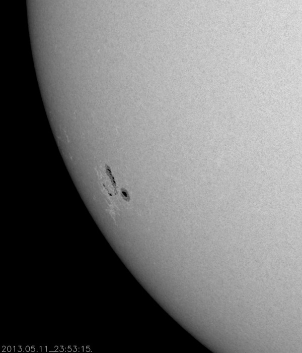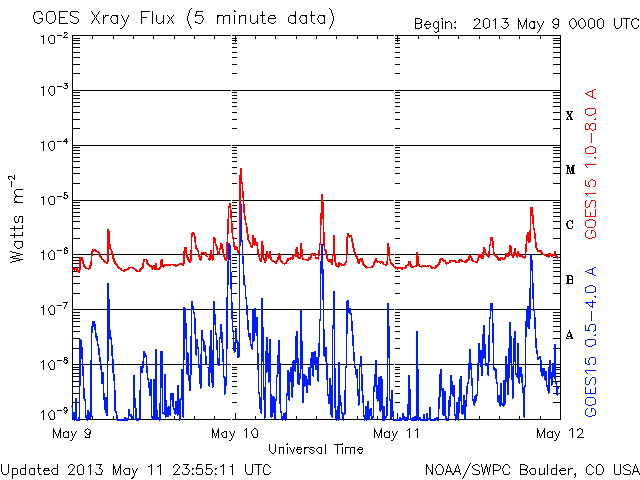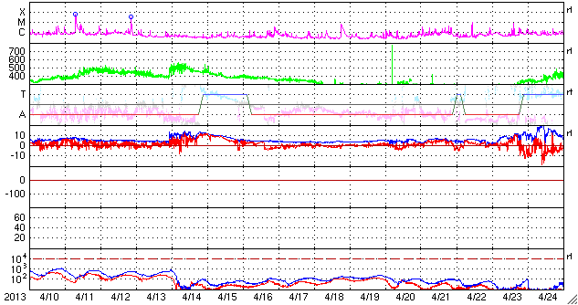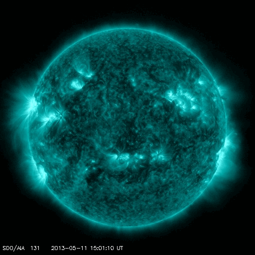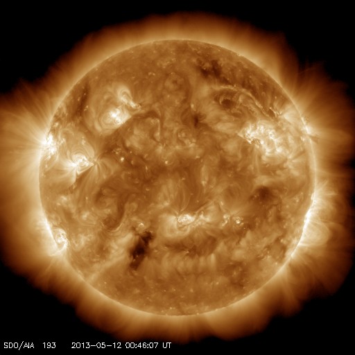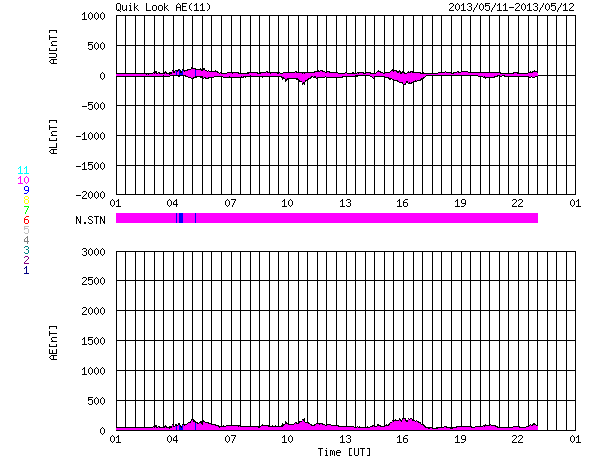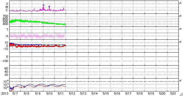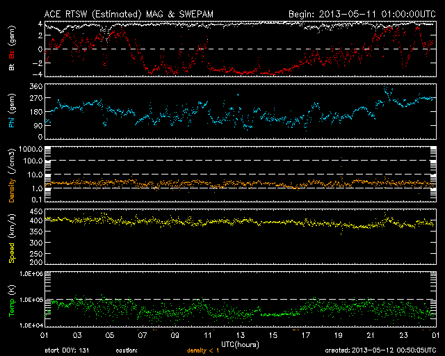 2013/ 5/12 09:50 更新 太陽の南東でC8.0の小規模フレアが発生しました。太陽風は平均的な状態です。 担当 篠原 太陽の南東端(左下)から現われた黒点に、 1746黒点群と番号が付けられました。 この領域で、今朝12日4時半(世界時11日19時半)に、 C8.0と大きめのCクラスフレアが発生しました。 SDO衛星AIA131によるフレアの動画を掲載します。 SDO衛星による1746黒点群の拡大写真を掲載しますが、 黒点群の左上の部分は、昨日から今日にかけて発達した領域です。 北東の1745、1744黒点群などとともに、 太陽では、今後も中小規模のフレアの活動が続く可能性があります。 太陽風は、400km/秒をやや割ったくらいと、 平均的な速度で安定しています。 磁場強度も4nTで安定し、太陽風は穏やかな状態です。 磁気圏も概ね静穏で、 AE指数の変化は200nT以下の小さなものが数回見られる程度です。 太陽風は、このまま穏やかに推移していくのか、 太陽の赤道付近に見えていた小さなコロナホールの影響が 多少見られるのか、注目してください。