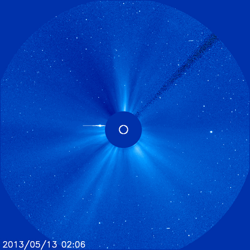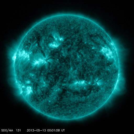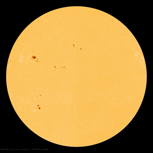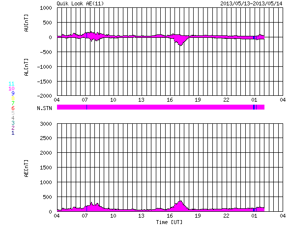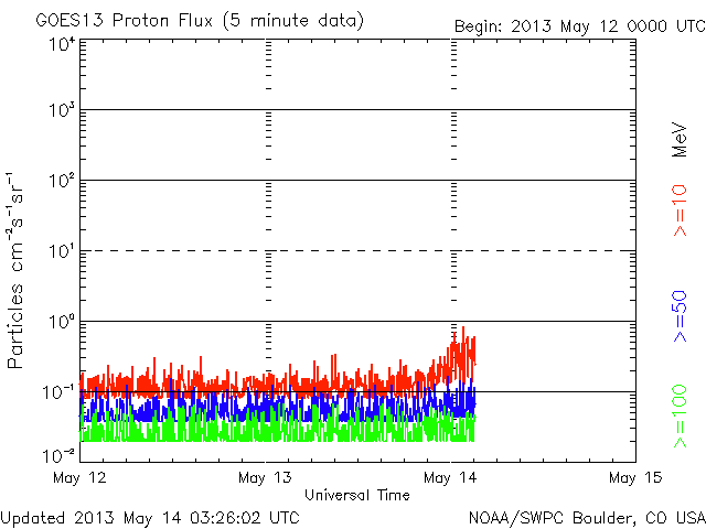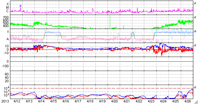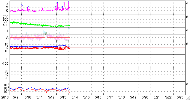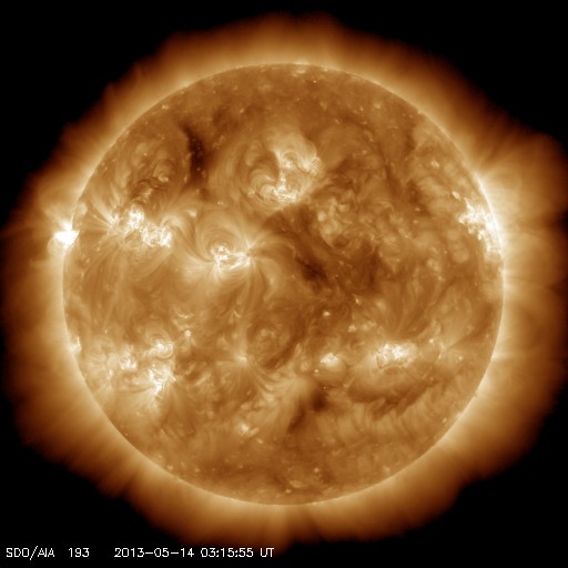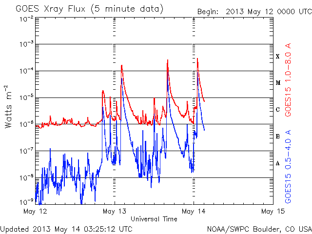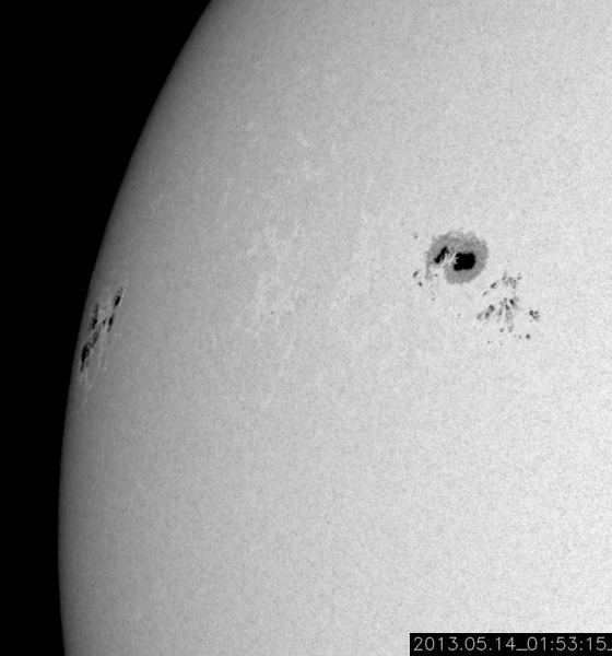 2013/ 5/14 12:29 更新 太陽でX2.8、X3.2と大規模フレアが続いています。東端から現れた1748黒点群で発生しています。 担当 篠原 昨日のニュースのX1.7に続いて、X2.8、X3.2と、 太陽の東端の1748黒点群でXクラスの大規模フレアの発生が続いています。 順番に発生時刻をまとめると、 昨日の昼、13日11時(世界時13日2時)にX1.7、 深夜、14日1時(世界時13日16時)にX2.8、 そして、今朝、14日10時(世界時14日1時)にX3.2と続いています。 フレアの規模が次第に大きくなっていますが、 SDO衛星の動画を見ると、 発生地点が太陽の向こう側からこちら側に回って来て、 発生領域の全体が見えるようになった影響も含まれるかもしれません。 太陽の可視光写真では、Xフレアを起こした黒点群が姿を現しています。 1748黒点群と番号が付けられました。 この後も、活発なフレアの発生が続く可能性があります。 太陽からの放射線(非常に高速の陽子)は、今のところ変化は小さいままです。 これから次第に増加する可能性があります。 フレアに伴って、CME(太陽ガスの放出現象)も発生しています。 最初のX1.7フレアに続くCMEの様子を、 SOHO衛星LASCO C3カメラの動画で紹介します。 地球に対して真横に噴き出しているので、影響は及びにくくなっています。 太陽風擾乱の到来まで2日程度と見積もると、 明日の昼前後に、太陽風の乱れがACE衛星で観測されるかもしれません。 どの程度の変動が来るでしょうか。 太陽風擾乱の到来が早いほど、乱れの速度も高いことになり、 より大きな磁気圏擾乱をもたらす可能性があります。 そして、磁気圏の乱れには、太陽風磁場の変動がどうなるかが重要です。 磁場強度の強まりと、南北成分がどの程度南を向くかに注目してください。 その後のXフレアに伴うCMEについては、 写真も整っていないので、明日のニュースで紹介します。 現在の太陽風は、370km/秒とやや低速の状態です。 磁場虚度は5nTと平均的な強度です。 磁気圏も概ね静穏で、AE指数は小規模の変化が2回ほど発生している程度です。 今後の太陽風磁気圏の状況は、CMEの擾乱次第となるでしょう。 今後は、太陽風の変動にも注目してください。 ![]() 東端の1748黒点群で発生した3つのXクラスフレア。 (c) SDO (NASA)、 (動画加工 : 宇宙天気ニュース) ![]() SDO衛星の可視光写真による、1748黒点群(左)と1745黒点群(右)。 (c) SDO (NASA) ![]() 昨日のX1.7フレアに伴って発生したCMEの様子。 (c) SOHO (ESA & NASA)、 (動画加工 : 宇宙天気ニュース) ![]() SDO衛星のAIA193カメラによる太陽コロナの様子 (c) SDO (NASA) ![]() SDO衛星による太陽の可視光写真。マウスの矢印を写真に重ねると、黒点番号付きの写真に切り替わります。 (c) SDO (NASA) ![]() GOES衛星の太陽X線データ (c) NOAA/SWPC ![]() GOES衛星の太陽放射線データ (c) NOAA/SWPC ![]() ACEが観測した太陽風の磁場(1番上の枠、白線は全体の強度、赤線は南北成分) および、太陽風の密度(3番目の橙線)、速度(4番目の黄線) (c) NOAA/SWPC ![]() リアルタイムAE指数 下段のAEグラフの値が高くなると、オーロラ活動が活発化しています。 (c) 京都大学, NICT ![]() 27日の太陽周期に合わせたデータプロット 太陽が同じ面を地球に向けていた27日前の変化から、今後を予想することができます。 (c) 作図:宇宙天気ニュース