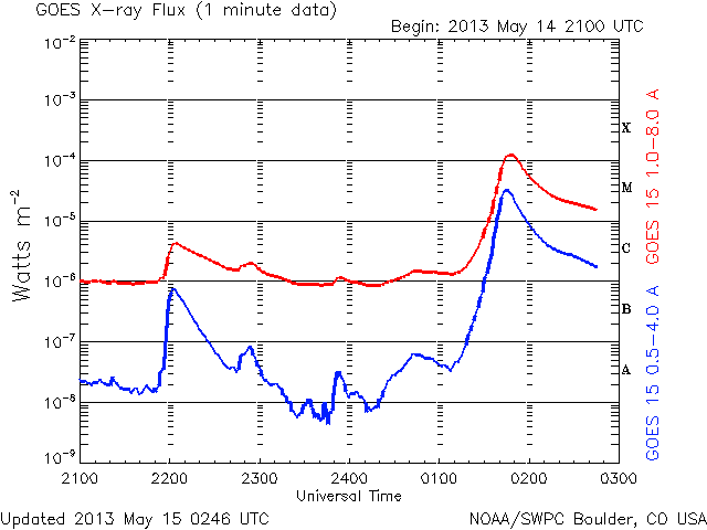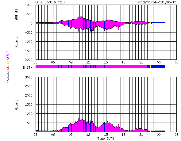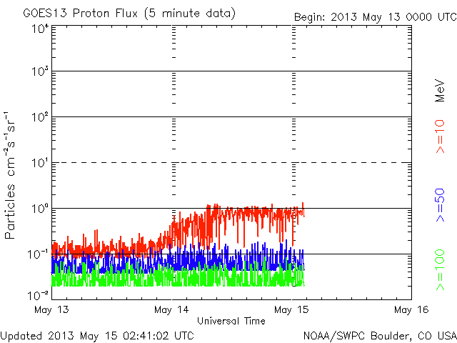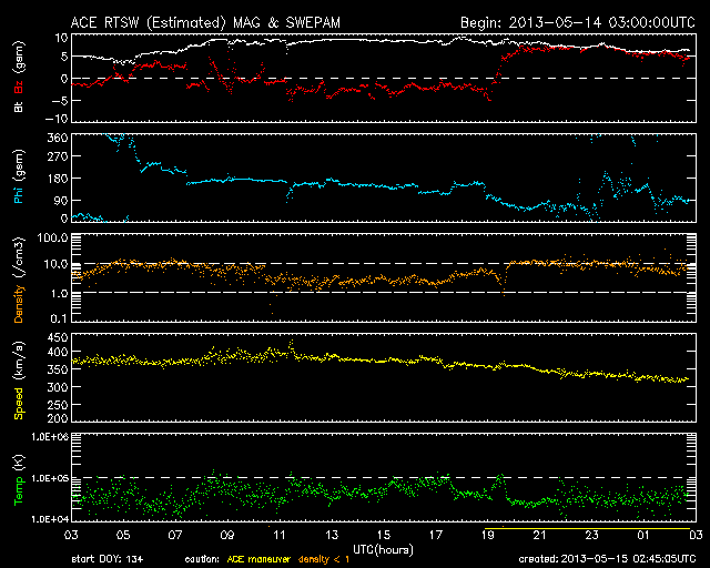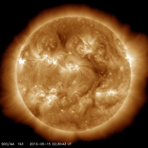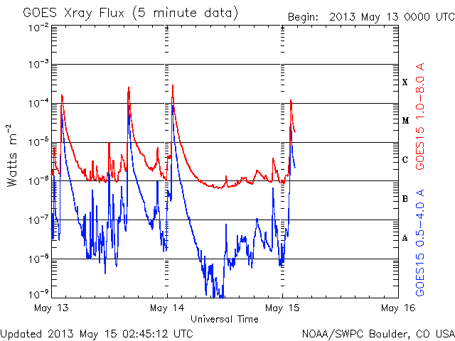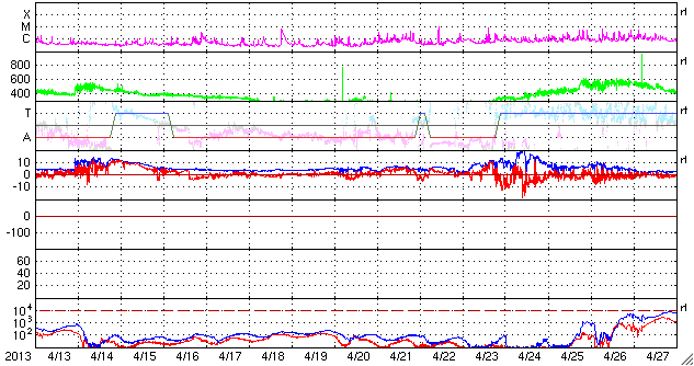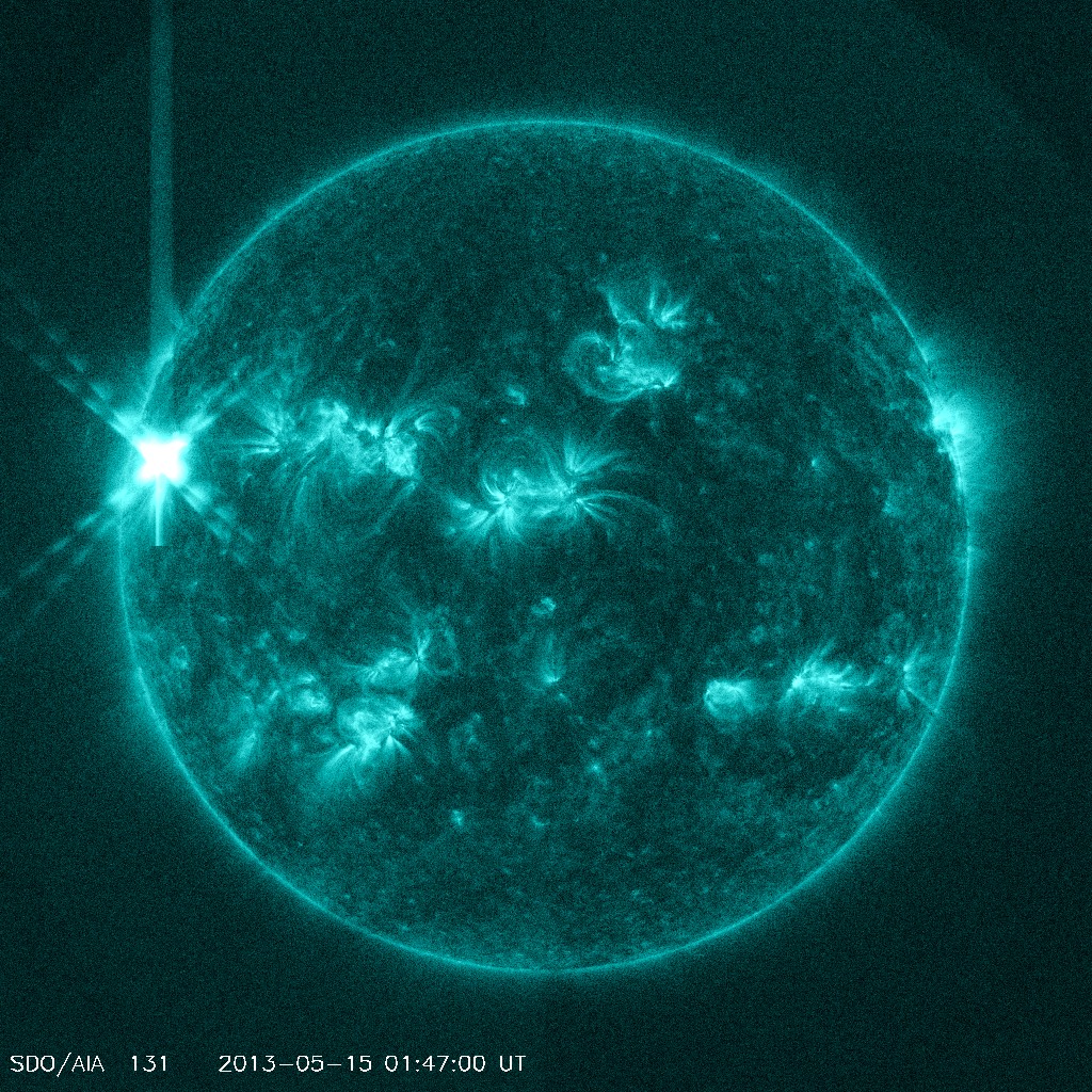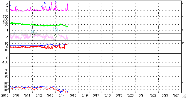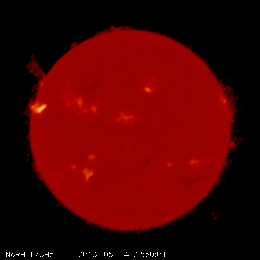 2013/ 5/15 11:46 更新 今朝、1748黒点群でX1.2の大規模フレアが発生しました。Xフレアは4回めです。 担当 篠原 先程、15日10時半(世界時15日1時半)に、太陽の東の1748黒点群で、 X1.2の大規模フレアが発生しました。 SDO衛星AIA131による、発生時の写真を掲載します。 1748黒点群は、これで13日以降に4つのXフレアを起こしました。 可視光による黒点群の拡大写真をご覧ください。 引き続き、この領域の活動に注目してください。 X1.2フレアは、日本の昼の時間に発生したので、 野辺山の電波ヘリオグラフでも観測されていました。 動画を掲載しているので、こちらもどうぞ。 私は運良く授業の合間だったので、Hα望遠鏡を屋上に出して、 フレア進行中の太陽を見ることができました。 ツーリボンとよばれる、明るい2本の筋を見ることができましたが、 生で見るのは格別です。 今日の写真では、STEREO Behind衛星から見た、 一昨日、昨日のフレアと、CMEの様子を紹介します。 STEREO Behind衛星は、地球から見ると太陽の左向こうにあります。 そのため、フレアを起こした1748黒点群は太陽の右端に見えています。 CMEのプラズマのガスが勢い良く噴き出していますが、 地球からは真横に向かっているため、 NOAAの予報によると、地球へ影響はほとんどやって来ない様です。 あくまで予報ですので、今後の太陽風の変化にも注目してください。 現在の太陽風は、速度が320km/秒へ下がり、 かなり低速になっています。 磁場強度は5nTから8nTにやや強まり、現在は6nTくらいに戻っています。 磁場がある程度南寄りになったためか、 AE指数は、500nTを超える程度の中規模の変動が発生しています。 オーロラの活動が見られた様です。 ![]() SDO衛星AIA131による、1748黒点群で発生したX1.2のフレア。 (c) SDO (NASA) ![]() SDO衛星の可視光写真による、1748黒点群(左)と1745黒点群(右)。 (c) SDO (NASA) ![]() 野辺山電波ヘリオグラフが観測したX1.2フレアの様子。 (c) 国立天文台野辺山太陽電波観測所 ![]() GOES衛星のX線強度の1分値データ。X1.2の大規模フレアが発生しました。 (c) NOAA/SWPC ![]() STEREO Behind衛星EUVI195による、一昨日、昨日のX1.7、X2.8、X3.2。 (c) STEREO (NASA)、 (動画加工 : 宇宙天気ニュース) ![]() STEREO Behind衛星COR2による、3つのXフレアに伴って発生したCME。 (c) STEREO (NASA)、 (動画加工 : 宇宙天気ニュース) ![]() SDO衛星のAIA193カメラによる太陽コロナの様子 (c) SDO (NASA) ![]() SDO衛星による太陽の可視光写真。マウスの矢印を写真に重ねると、黒点番号付きの写真に切り替わります。 (c) SDO (NASA) ![]() GOES衛星の太陽X線データ (c) NOAA/SWPC ![]() GOES衛星の太陽放射線データ (c) NOAA/SWPC ![]() ACEが観測した太陽風の磁場(1番上の枠、白線は全体の強度、赤線は南北成分) および、太陽風の密度(3番目の橙線)、速度(4番目の黄線) (c) NOAA/SWPC ![]() リアルタイムAE指数 下段のAEグラフの値が高くなると、オーロラ活動が活発化しています。 (c) 京都大学, NICT ![]() 27日の太陽周期に合わせたデータプロット 太陽が同じ面を地球に向けていた27日前の変化から、今後を予想することができます。 (c) 作図:宇宙天気ニュース