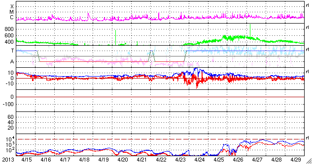 (c) SDO (NASA)、 (動画加工 : 宇宙天気ニュース) ![]() GOES-15衛星のX線カメラによるC8.4フレアの様子。 (c) NOAA/SWPC 、(動画加工 : 宇宙天気ニュース) ![]() 太陽風の磁場が南向きに振れ、昭和基地で活発なオーロラが観測されました。 (c) 国立極地研究所 ![]() SDO衛星のAIA193カメラによる太陽コロナの様子 (c) SDO (NASA) ![]() SDO衛星による太陽の可視光写真。マウスの矢印を写真に重ねると、黒点番号付きの写真に切り替わります。 (c) SDO (NASA) ![]() GOES衛星の太陽X線データ (c) NOAA/SWPC ![]() GOES衛星の太陽放射線データ (c) NOAA/SWPC ![]() ACEが観測した太陽風の磁場(1番上の枠、白線は全体の強度、赤線は南北成分) および、太陽風の密度(3番目の橙線)、速度(4番目の黄線) (c) NOAA/SWPC ![]() リアルタイムAE指数 下段のAEグラフの値が高くなると、オーロラ活動が活発化しています。 (c) 京都大学, NICT ![]() 27日の太陽周期に合わせたデータプロット 太陽が同じ面を地球に向けていた27日前の変化から、今後を予想することができます。 (c) 作図:宇宙天気ニュース
