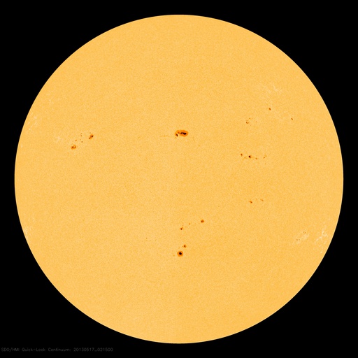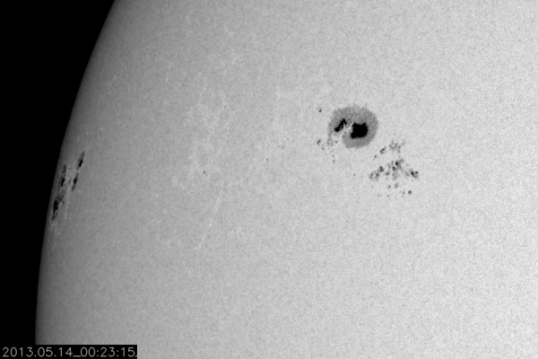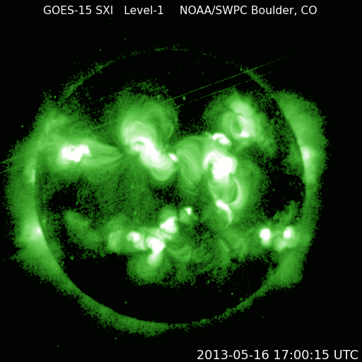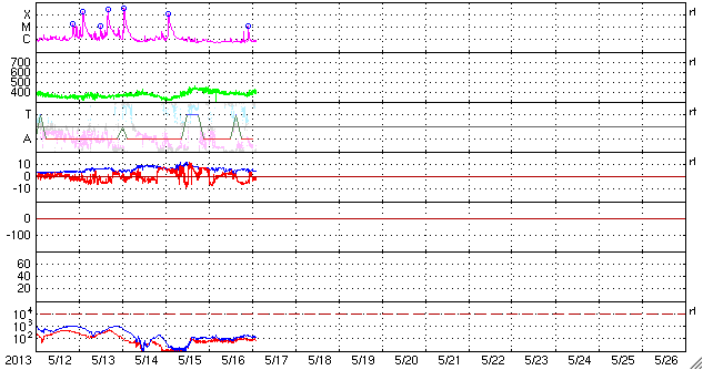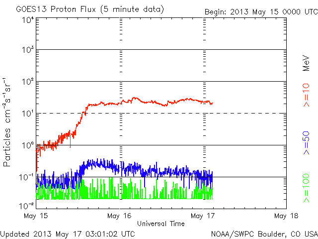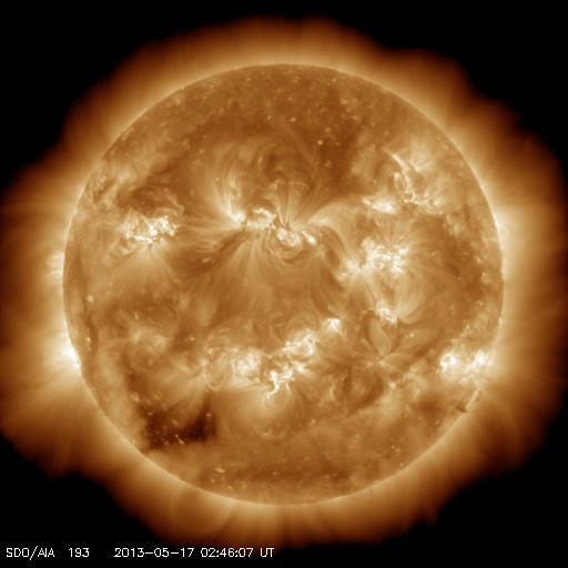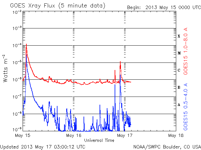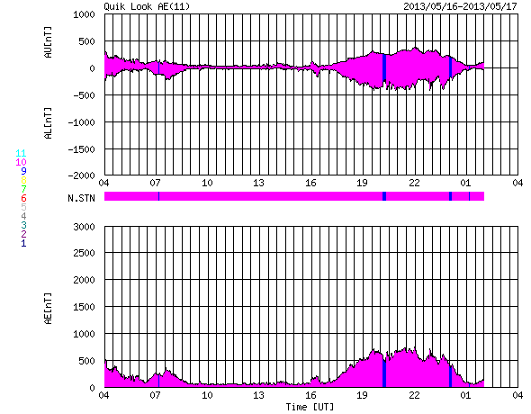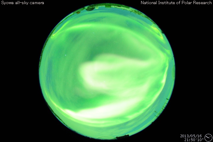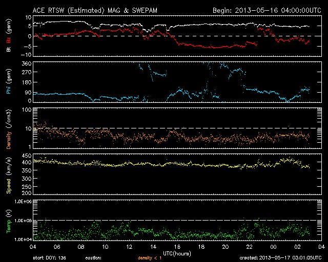 2013/ 5/17 12:01 更新 1748黒点群でM1.3の中規模フレアが発生しました。今夜くらいに太陽風の乱れが到来するかもしれません。 担当 篠原 1748黒点群が太陽の東端に現れて、およそ3日が経過しました。 その間の黒点群の変化を、SDO衛星の可視光写真による動画で紹介します。 出現直後は黒点の形や大きさの変化が激しかったのですが、 昨日あたりからは全体的に小さくなっている印象を受けます。 今後、黒点群としてどの様に変化して行くのでしょうか。 その1748黒点群で、目立ったフレアが2回発生しています。 17日4時(世界時16日19時)にC4.8、 17日6時半(世界時16日21時半)にM1.3です。 フレアの様子を、GOES衛星のX線カメラによる動画で紹介します。 NOAAの報告によると、1748黒点群の磁場構造はβγδと現在も複雑で、 大きなエネルギーを蓄えている可能性があります。 この後も、大きなフレアを発生させるかもしれません。 太陽風は、400km/秒と平均的な速度で安定しています。 磁場強度も、5nTと平均レベルで落ち着いていますが、 磁場の南北成分が、7時間ほど-5nTとまとまった南向きになっています。 このため、磁気圏の活動も高まって、 AE指数で600nTほどの変化が6時間ほど続いています。 昭和基地の全天カメラで、きれいなオーロラの活動が観測されています。 動画ではありませんが、その1枚をご覧ください。 昨日お伝えしたように、 今夜前後に15日朝のX1.2フレアに伴って発生したCMEによる 太陽風の乱れが到来する可能性があります。 速度が大きく乱れることはなさそうですが、 強い磁場のかたまりが流れてきて、大きく南向きに振れると、 オーロラの活動が激しくなる可能性があります。 ACE衛星の太陽風データでは、速度(黄色線)の変化とともに、 磁場の強度(白線)、南北成分(赤線)の変化にも注目してください。