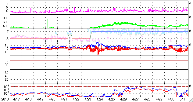 磁場強度は、昨日の乱れの影響で10nTくらいに強まっていましたが、