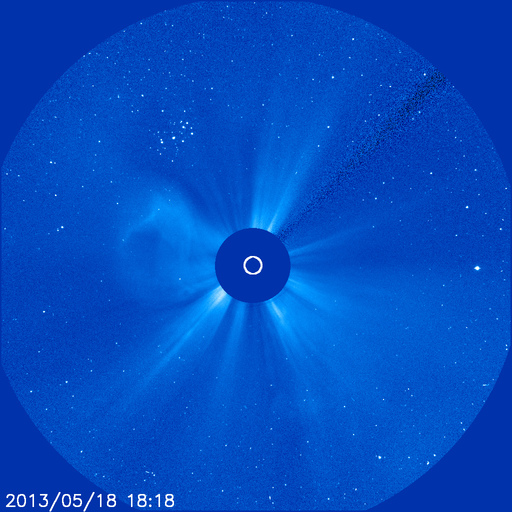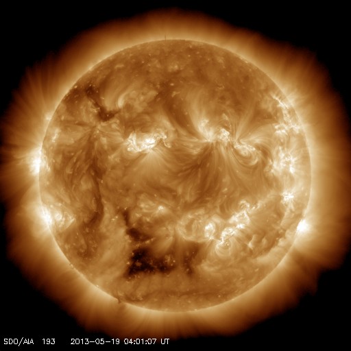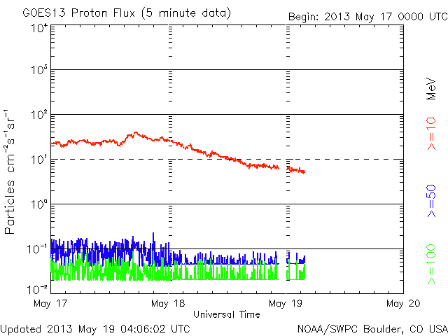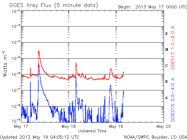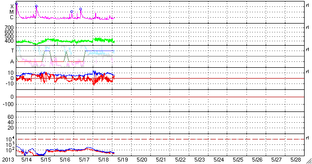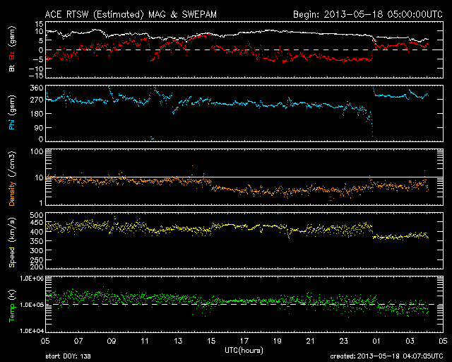2013/ 5/18 13:12 1748黒点群でM3.2の中規模フレアが発生しました。今朝、小規模の太陽風の乱れが到来しました。