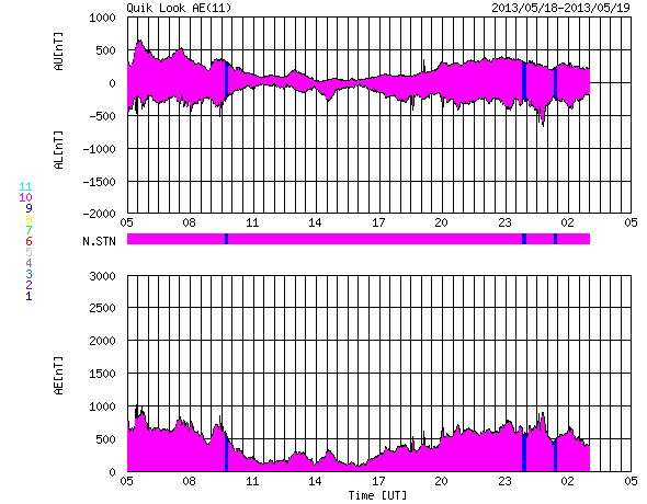 下段のAEグラフの値が高くなると、オーロラ活動が活発化しています。