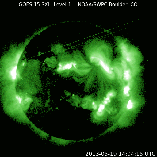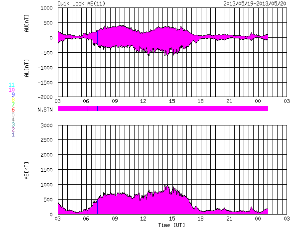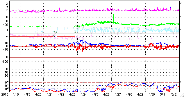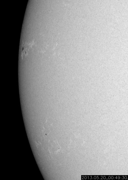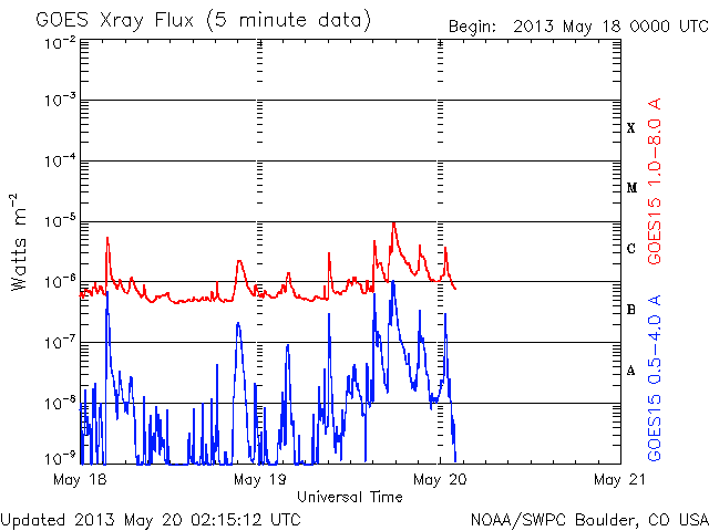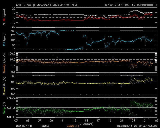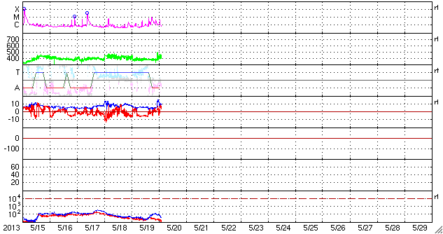 2013/ 5/20 11:18 更新 太陽の東西でCクラスのフレアが続いています。弱い太陽風の乱れが到来しました。 担当 篠原 太陽は、昨日の夜くらいから活動度が高まり、 20日0時(世界時20日15時)にC6.3、 20日2時(世界時20日17時)にC9.9、 20日6時(世界時20日21時)にC4.7と、 大きめの小規模フレアが続いて起きています。 GOES衛星のX線カメラによる動画を掲載します。 太陽の右と左で次々に爆発が発生しています。 発生地点は西端(右端)の1750黒点群と、 東端(左端)に現れた新しい黒点群で、 これまで注目されていた太陽中央部の1748群ではありません。 1748黒点群は、昨日よりも更に小さくなっています。 太陽の東端では、 北半球側と南半球側それぞれに新しい黒点が現われています。 大きさはそれほどでもありませんが、 C9.9のフレアを起こしているので、今後の動きに注目して下さい。 太陽風は、17日のCMEの影響が、 今朝、20日7時半(世界時19日22時半)にACE衛星で観測されています。 変化は小さく、速度は380km/秒から450km/秒に上がった程度です。 磁場強度も、5nTから一時的に15nTに上がって、現在は10nTです。 磁場の南北成分は北向きに振れています。 そのため、磁気圏への影響は強まっていません (AE指数のグラフの右端の部分)。 むしろ、AE指数のグラフでは、 その前に起きていた700〜1000nTの大きな変化が目立っています。 これは、太陽風磁場の南北成分が半日近く -5nTの南向きになっていた影響です。 今後の太陽風についてですが、 27日周期の図の前周期の4月24日以降に発生している 太陽風磁場のセクターの切り替わりと、速度の高まりが、 明日以降に回帰してくる可能性があります。 過去、4周期くらいに見られている変化です。 SDO衛星AIA193の太陽コロナ写真では、 南半球側に大きなコロナホールが見えています。 ![]() 太陽の右端と左端でCクラスのフレアが続きました。GOES衛星のX線写真。 (c) NOAA/SWPC 、(動画加工 : 宇宙天気ニュース) ![]() 太陽の東端から新しい黒点群が姿を現しました (c) SDO (NASA) ![]() SDO衛星のAIA193カメラによる太陽コロナの様子 (c) SDO (NASA) ![]() SDO衛星による太陽の可視光写真。マウスの矢印を写真に重ねると、黒点番号付きの写真に切り替わります。 (c) SDO (NASA) ![]() GOES衛星の太陽X線データ (c) NOAA/SWPC ![]() ACEが観測した太陽風の磁場(1番上の枠、白線は全体の強度、赤線は南北成分) および、太陽風の密度(3番目の橙線)、速度(4番目の黄線) (c) NOAA/SWPC ![]() リアルタイムAE指数 下段のAEグラフの値が高くなると、オーロラ活動が活発化しています。 (c) 京都大学, NICT ![]() 27日の太陽周期に合わせたデータプロット 太陽が同じ面を地球に向けていた27日前の変化から、今後を予想することができます。 (c) 作図:宇宙天気ニュース