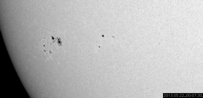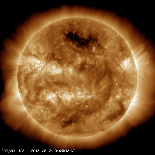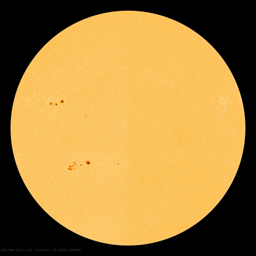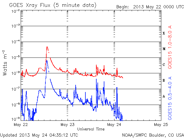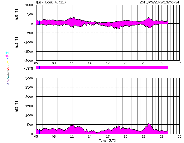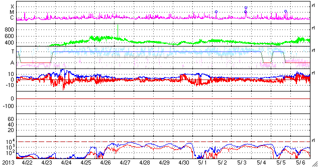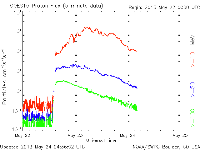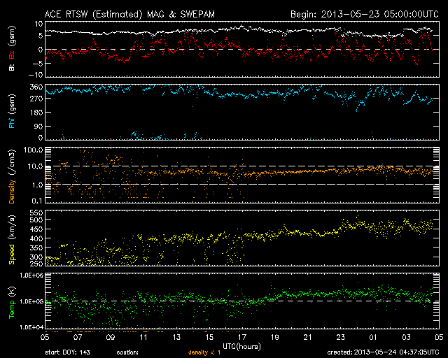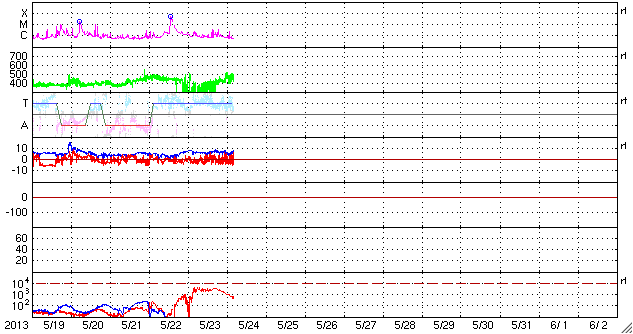 2013/ 5/24 13:38 更新 太陽南東の1756黒点群が大きくなっています。今夜以降に太陽風の乱れが到来する可能性があります。 担当 篠原 太陽の南東(左下)の1756黒点群が次第に大きくなっています。 SDO衛星可視光写真による、この2日間の変化を動画で紹介します。 黒点が動いてくっついたり、小さな黒点が発生・消滅したり、 半暗部(灰色の部分)が広がる様子など、様々な変化が見えます。 1756黒点群では、小規模のフレアも続いていて、 昨夜以降、C3.9、C2.6、C3.4などが発生しています。 今後更に大きなフレアを起こすようになるのか、注目して下さい。 一昨日のM5フレアに伴って増加していた太陽放射線(高速の陽子)は、 昨日の昼頃にピークを迎えて、以降、ゆっくりと減少しています。 現在はちょうど100くらいで、もうしばらく警戒レベルの10を超えそうです。 太陽風は、ACE衛星の観測が太陽放射線の影響から回復した様で、 現在の速度は460km/秒とやや高速です。 磁場強度は7nTと少し強めの値です。 一昨日に見られた太陽風速度の高まりが、そのまま続いている様です。 前周期ほどではありませんが、 太陽風の変化がある程度回帰してきたのかもしれません。 太陽風磁場の南北成分は、+3〜-3nT程度で南北に変動しています。 このため、AE指数は300〜500nTの小規模の変化が連続しています。 今後の注目は、M5フレアに伴って発生したCMEの影響です。 今夜から明日にかけて太陽風の乱れが到来する可能性があります。 変化はそれほど大きくないだろうと思いますが、 磁場強度の強まりや速度の変化がどの程度になるか、 ACE衛星やAE指数のデータに注目して下さい。 ![]() SDO衛星可視光写真による、1756黒点群の2日間の変化。 (c) SDO (NASA)、 (動画加工 : 宇宙天気ニュース) ![]() SDO衛星のAIA193カメラによる太陽コロナの様子 (c) SDO (NASA) ![]() SDO衛星による太陽の可視光写真。マウスの矢印を写真に重ねると、黒点番号付きの写真に切り替わります。 (c) SDO (NASA) ![]() GOES衛星の太陽X線データ (c) NOAA/SWPC ![]() GOES衛星の太陽放射線データ (c) NOAA/SWPC ![]() ACEが観測した太陽風の磁場(1番上の枠、白線は全体の強度、赤線は南北成分) および、太陽風の密度(3番目の橙線)、速度(4番目の黄線) (c) NOAA/SWPC ![]() リアルタイムAE指数 下段のAEグラフの値が高くなると、オーロラ活動が活発化しています。 (c) 京都大学, NICT ![]() 27日の太陽周期に合わせたデータプロット 太陽が同じ面を地球に向けていた27日前の変化から、今後を予想することができます。 (c) 作図:宇宙天気ニュース