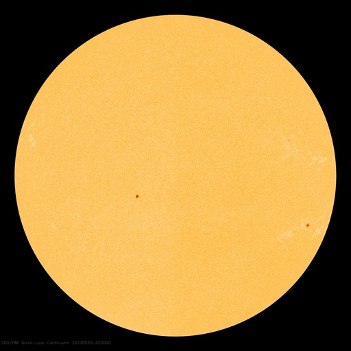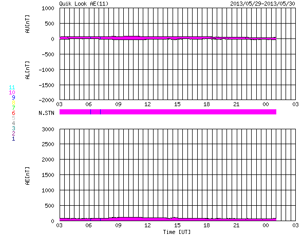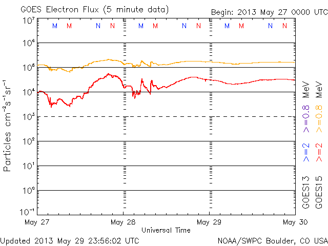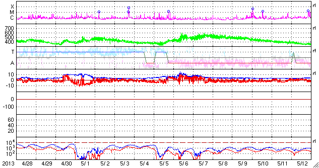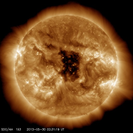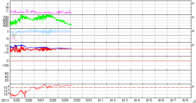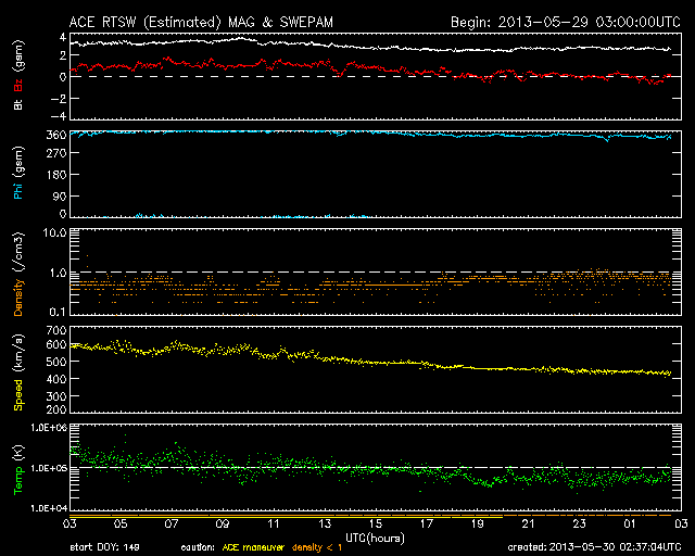 2013/ 5/30 11:32 更新 高速の太陽風は終わり、速度は430km/秒に下がっています。 担当 篠原 太陽風の速度は、昨日のニュース以降に再び低下を始め、 600km/秒とかなり高い速度から430km/秒と平均的な状態へ、 1日で下がってしまいました。 もう少し時間をかけて下がるかと思ったのですが、 今回の高速風は、あっさりと終わってしまいました。 磁場強度は3nTと弱まったままです。 南北成分は弱い北寄りになっていて、磁気圏も静穏です。 AE指数は全く変化していません。 SDO衛星AIA193では、太陽中心部のコロナホールが西側へ進んでいます。 明後日くらいからこの領域の影響で、太陽風の速度が再び高まりそうです。 昨日紹介したように、コロナホールは27日前の姿より大きく広がっています。 27日周期の図の前周期に見られた500km/秒台の高速風(5月5〜9日)は、 より高い速度になって回帰するかもしれません。 放射線帯の高エネルギー電子は、 今日も30,000と高い値を保っています。 太陽風の擾乱が来るまでは、ゆっくりとした低下になるでしょう。 太陽の活動は、C1〜C3の小さなフレアが3回発生した程度です。 この中の2つを、東端の1760黒点群が起こしています。 小さな黒点群ですが、この様な活動を今後も続けるかもしれません。 ![]() SDO衛星のAIA193カメラによる太陽コロナの様子 (c) SDO (NASA) ![]() SDO衛星による太陽の可視光写真。マウスの矢印を写真に重ねると、黒点番号付きの写真に切り替わります。 (c) SDO (NASA) ![]() ACEが観測した太陽風の磁場(1番上の枠、白線は全体の強度、赤線は南北成分) および、太陽風の密度(3番目の橙線)、速度(4番目の黄線) (c) NOAA/SWPC ![]() リアルタイムAE指数 下段のAEグラフの値が高くなると、オーロラ活動が活発化しています。 (c) 京都大学, NICT ![]() 27日の太陽周期に合わせたデータプロット 太陽が同じ面を地球に向けていた27日前の変化から、今後を予想することができます。 (c) 作図:宇宙天気ニュース