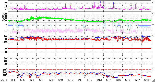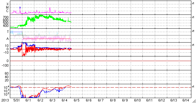 2013/ 6/ 1 13:04 太陽風の乱れが到来して、磁場が大きく南に振れています。磁気圏活動も強まっています。