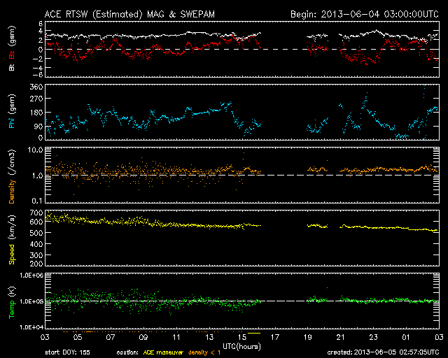 2013/ 6/ 3 09:50 700km/秒台の高い速度の太陽風が続いています。磁気圏も中規模の活動が続いています。