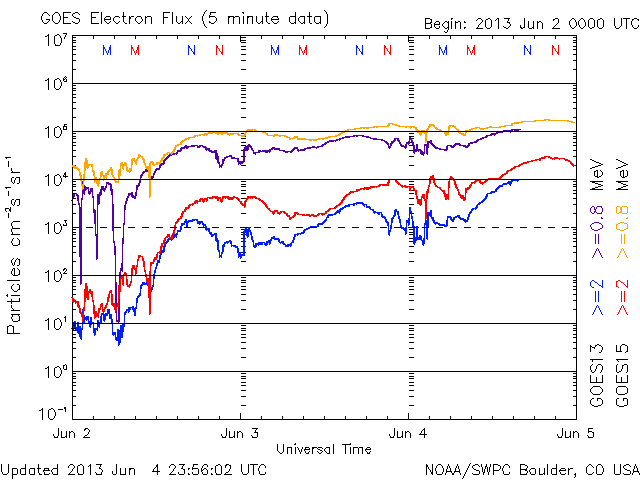 放射線帯電子が非常に強くなっています。太陽放射線は静穏です。