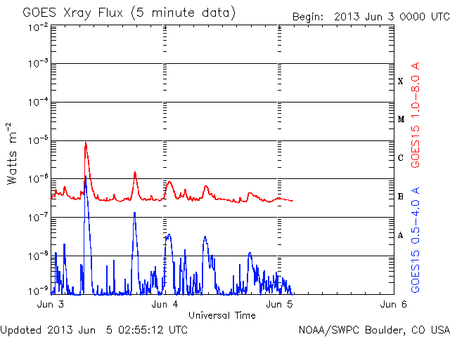 2013/ 6/ 4 12:12 600km/秒台の高速太陽風が続いています。太陽ではC9.5のフレアが発生しています。