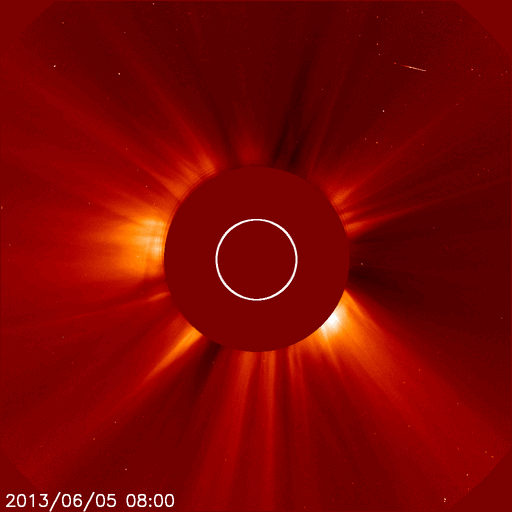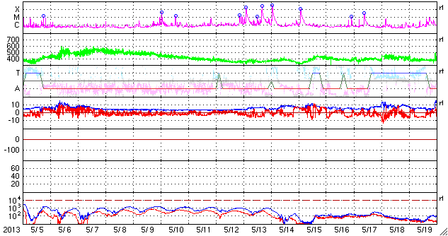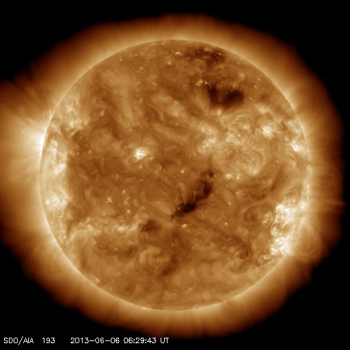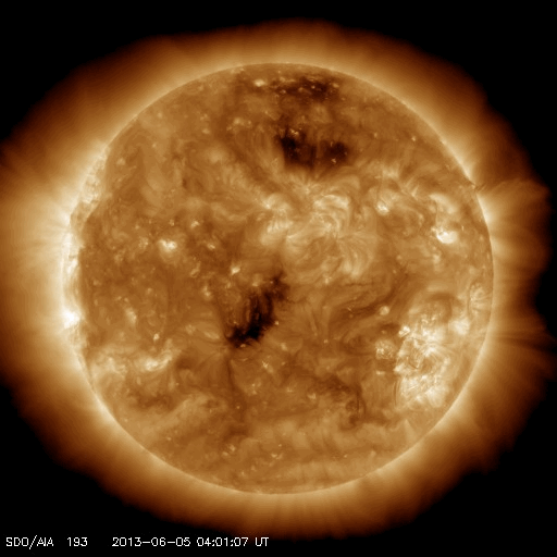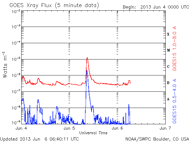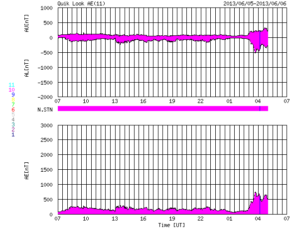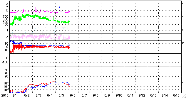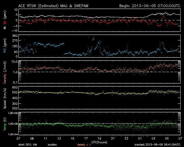 2013/ 6/ 6 15:42 更新 太陽風は500km/秒の高速風が続いています。昨夕M1.3のフレアが発生しました。 担当 篠原 太陽風の速度は、一旦480km/秒くらいへ下がったのですが、 今朝になって再度高まり、510km/秒の高速風が続いています。 磁場強度も一緒に変化して、5nTと平均的な強度に上がっています。 磁気圏の活動は、昨日以降静かになっていたのですが、 磁場強度が回復した後、南北成分が南向きに振れる様になり、 AE指数で700nTと中規模の変化が発生しています。 しかし、今回の太陽風の変化は一時的なもので、 この後は再び弱まって行くでしょう。 一方、SDO衛星AIA193を見ると、 中央の小規模のコロナホールは太陽の中心線を通り過ぎていて、 2〜3日後に弱い影響が地球にやってくるかもしれません。 太陽では、昨日の夕方、5日17時(世界時5日8時)に、 南西(右下)の1762黒点群でM1.3の中規模フレアが発生しました。 フレアの様子を、SDO衛星AIA193の動画で紹介します。 また、このフレアに続いて、 太陽の南に向って噴出するCMEが観測されています。 南に向いているので、地球への影響はなさそうです。 太陽は、以降はフレアもなく穏やかです。 1762黒点群は、Bクラスの小さな変化を起こした程度です。 放射線帯の高エネルギー電子は、今日も高い値を保っています。 増加は終わったようで、今後は低下に向かうでしょう。 今日は、いろいろと用件が重なってしまい、 更新がだいぶ遅くなってしまいました。 すみません。