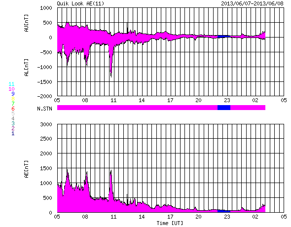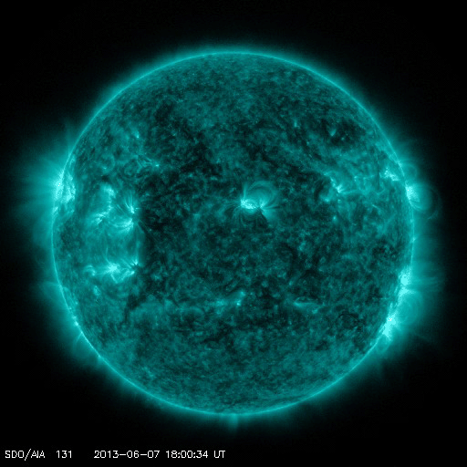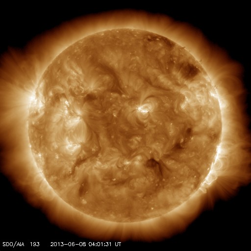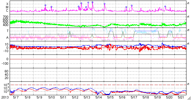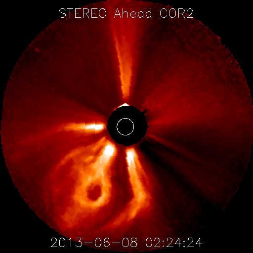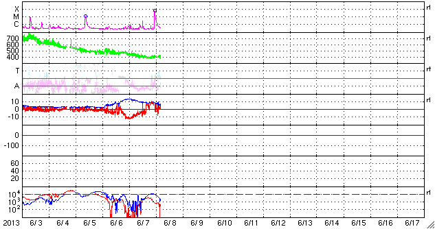 2013/ 6/ 8 13:21 更新 今朝、M5.9の中規模フレアが発生しました。太陽風の磁場の乱れは通り過ぎました。 担当 篠原 今朝、8日7時(世界時7日22時)に、 太陽の南西の端(右下)にある1762黒点群で、 M5.9と大きめの中規模フレアが発生しました。 SDO衛星AIA131による動画を掲載します。 太陽の端、ぎりぎりのところで発生しています。 爆発の後にループ状のプロミネンスが美しく見えています。 このフレアに伴って、CME(太陽ガスの放出現象)も発生しています。 SOHO衛星の写真が更新されていないので、 STEREO Ahead衛星COR2の写真を紹介します。 地球から見ると、太陽の右下に向かって噴き出しているはずですが、 太陽の右の向こう側にあるこの衛星からは、 左下方向に噴き出しています。 地球への影響はほとんどなさそうです。 太陽は、中央部に1765黒点が残っていますが、 フレアの活動はほとんど起こしていません。 1762群が西の端に没した後は、静かになりそうです。 太陽風は、速度は410km/秒と昨日からほとんど変わっていませんが、 磁場強度は次第に弱まって、 13nTから現在は6nT程度に下がっています。 値としては、平均的な強さに戻ったくらいです。 太陽風磁場の南北成分は、 8日0時(世界時7日15時)くらいまでは南に向いていましたが、 それ以降は、北に転じて、現在は0nT付近です。 磁気圏の活動もこれに対応して、 AE指数のグラフは、 前半は1300nTを超える激しい変化が何度も発生していますが、 後半は急に変化が小さくなり、磁気圏は静かになっています。 27日周期の図のIMFのグラフを見ると、 今回の磁場の強まりの様子が良く分かります。 変化は過ぎ去って、太陽風は落ち着きそうですが、 一方、一昨日のニュースでお知らせしていたように、 これから小規模のコロナホールの影響がやって来るかもしれません。 太陽風の速度がいくらか高まるかもしれません。 放射線帯の高エネルギー電子は、再び高まって、 青線のGOES15で10,000に達しています。 ![]() 南西の1762黒点群で発生したM5.9の中規模フレア。SDO衛星AIA131。 (c) SDO (NASA)、 (動画加工 : 宇宙天気ニュース) ![]() STEREO Ahead衛星COR2カメラによる、M5.9フレアに伴って噴出したCME。 (c) STEREO (NASA) ![]() SDO衛星のAIA193カメラによる太陽コロナの様子 (c) SDO (NASA) ![]() SDO衛星による太陽の可視光写真。マウスの矢印を写真に重ねると、黒点番号付きの写真に切り替わります。 (c) SDO (NASA) ![]() GOES衛星の太陽X線データ (c) NOAA/SWPC ![]() ACEが観測した太陽風の磁場(1番上の枠、白線は全体の強度、赤線は南北成分) および、太陽風の密度(3番目の橙線)、速度(4番目の黄線) (c) NOAA/SWPC ![]() リアルタイムAE指数 下段のAEグラフの値が高くなると、オーロラ活動が活発化しています。 (c) 京都大学, NICT ![]() 27日の太陽周期に合わせたデータプロット 太陽が同じ面を地球に向けていた27日前の変化から、今後を予想することができます。 (c) 作図:宇宙天気ニュース