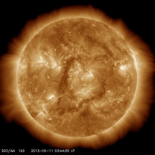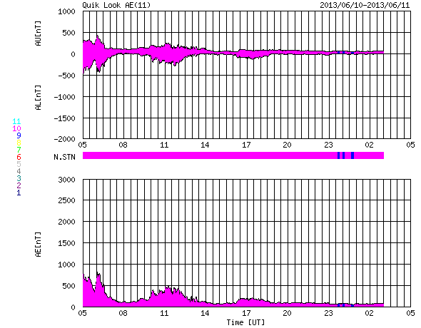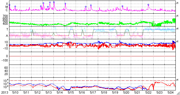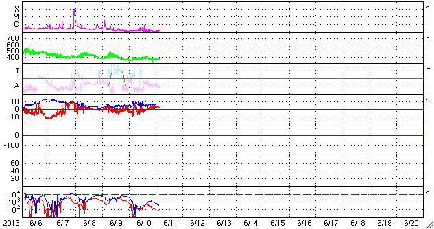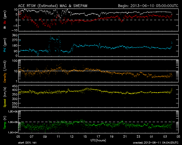 2013/ 6/11 13:04 更新 太陽は1765黒点群だけ見えています。太陽風は300km/秒台後半とやや低速です。 担当 篠原 NOAAのリストでは、黒点群は再び1765群ひとつになっています。 黒点はしばらく少なくなるのでしょうか。 その1765群は、昨夜、10日23時半(世界時10日14時半)にC1.9、 その前後にBクラスの小さなフレアを続けて起こしました。 以降は静かになって、X線のグラフに変化はありません。 太陽は穏やかな状態が続きそうです。 太陽風は、350〜400km/秒と多少上下していますが、 やや低速の風が続いています。 磁場強度は、昨日のニュースの頃に少し強まっていて、 7〜8nTに上がっています。 磁場の南北成分は、 ACEの図の前半は南寄り、後半は北寄りに変わり、 磁気圏のオーロラ活動を表すAE指数も、 前半は500〜800nTの変化が見られ、後半は静かになっています。 太陽風は、この後も基本的には穏やかな風が続くと思われます。 SDO衛星AIA193の写真には、コロナホールは見られません。 放射線帯の高エネルギー電子は、 磁気圏活動の高まりを受けて、一段減少しています。