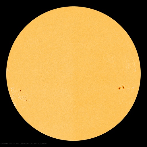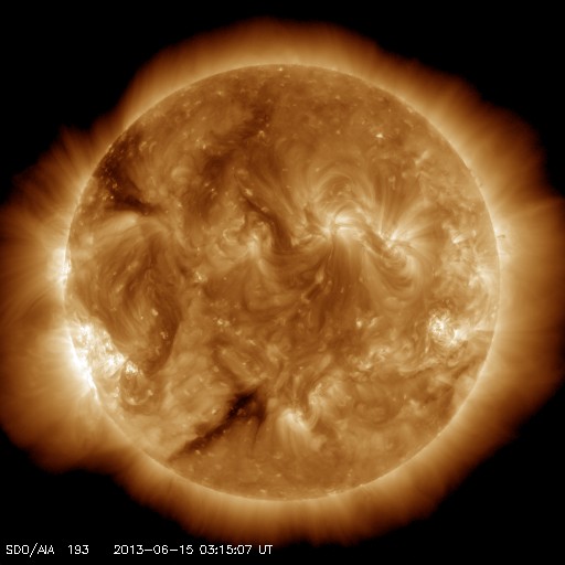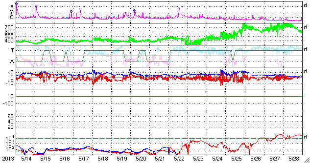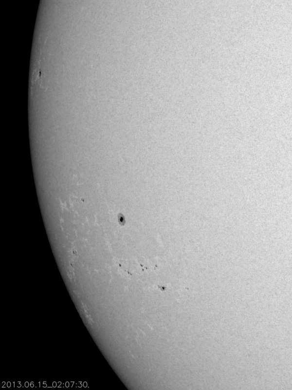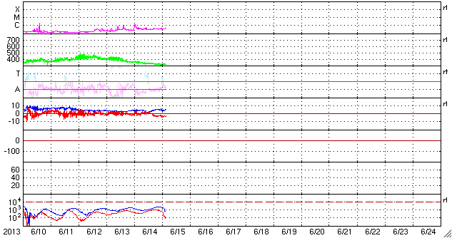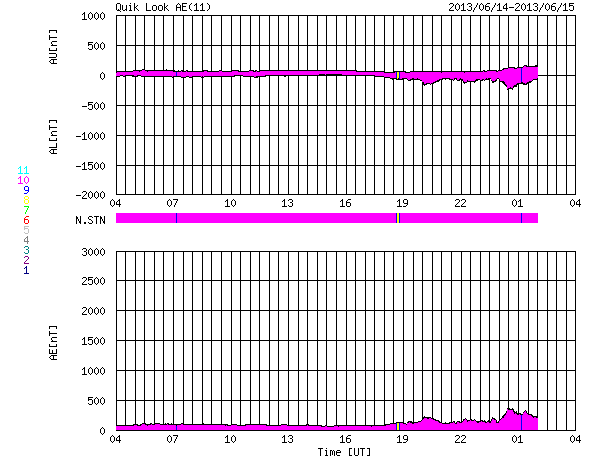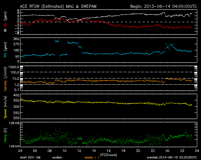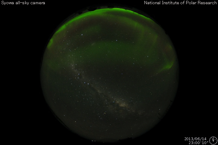 2013/ 6/15 12:21 更新 太陽風は320km/秒と低速になっています。太陽の東から黒点が更に現われています。 担当 篠原 太陽風の速度は、350km/秒から更に下がって、 320km/秒と一段と速度の遅い風になっています。 太陽風の磁場強度は、4nTから一旦2nTに下がり、 その後すぐに回復して、現在は5nT前後で推移しています。 この変化の前後で南北成分の傾向が変わり、 昨夜以降、-3nTと小さい振れ幅ですが、 南に振れたままの状態が続いています。 速度が遅いこともあり、磁気圏の変動は小規模に留まっていますが、 AE指数には200〜300nTの変化が見られています。 南極の昭和基地の全天カメラできれいなオーロラの活動が見られたので、 動画を紹介します。 世界時15日0時前後の様子で、AE指数のグラフの、 右端の小さな山の頃です。 太陽風は、このまま穏やかな状態が続きそうです。 磁気圏も、太陽風の磁場の振れ方で、 小規模の活動が見られるくらいでしょうか。 太陽は、東の端から新しい黒点が次々に姿を現しています。 SDO衛星の可視光カメラによるこの領域の拡大写真を掲載します。 小さい黒点ばかりですが、多数見えています。 南東の黒点には、1771、1772黒点群と番号が付けられましたが、 拡大写真を見ると、更に別の黒点群番号も加わりそうです。 また、赤道付近にも番号のまだない黒点群が現われています。 フレアの活動は現在は静かで、 X線のグラフはほとんど変化していません。 これらの黒点群の今後の活動に注目してください。