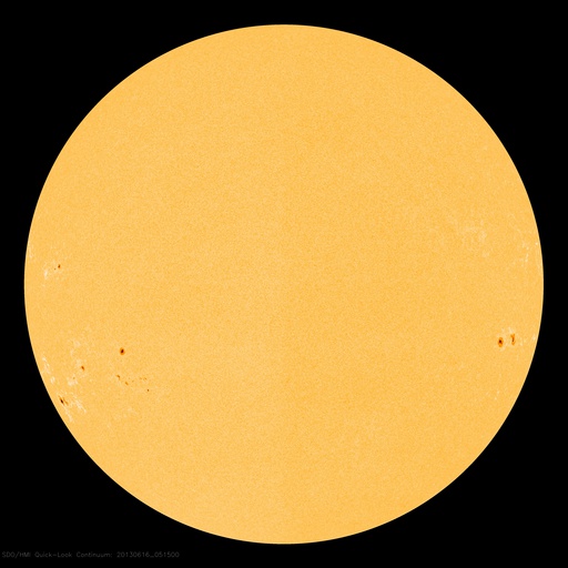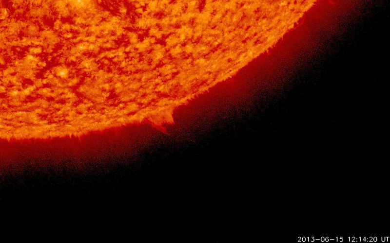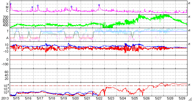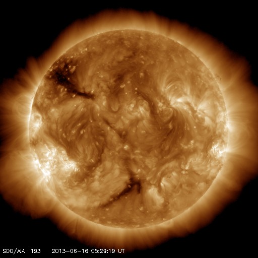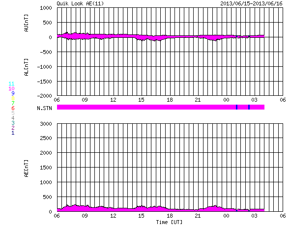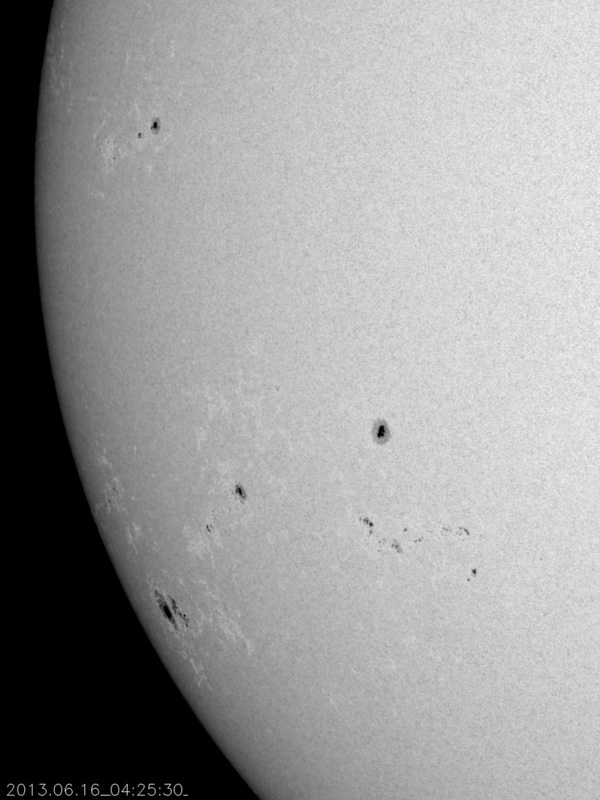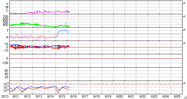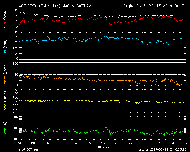2013/ 6/16 14:40 更新 太陽の東側に黒点群が7つ見えています。太陽風は低速で、磁気圏も穏やかです。 担当 篠原 一昨日のニュースでも紹介しましたが、 今度は太陽の南の端から雄大なプロミネンスの噴出が発生しました。 SDO衛星AIA304による動画をご覧ください。 今回の噴出では、奥に向かってループが伸びている様に見えます。 太陽の南東の端から更に黒点が姿を現しています。 昨日の1769、1770、1771、1772黒点群に加えて、 1774、1775群が新しく現れました。 赤道付近の1773群と合わせて、7つの黒点群が東端に集まっています。 SDO衛星可視光カメラの拡大写真を掲載します。 フレアの活動は、C1以下の小さな変動ばかりですが、 あちこちの黒点群で発生するようになっています。 活動の規模が高まって行くかどうか注目してください。 太陽風は、昨日のニュースの後、350km/秒に少し上がり、 そのまま安定しています。 低速の風であることに変わりはありません。 磁場強度も、5nTと平均的な値で安定しています。 南北成分は比較的北寄りに変わり、 磁気圏の活動は小さくなっています。 AE指数は200nTの変化が見られる程度です。 太陽風は、この後も穏やかな状態が続きそうです。 SDO衛星AIA193の写真では、 太陽の中央部の南半球側に細長いコロナホールがありますが、 前周期よりも小さくなっていて、影響は小さそうです。
