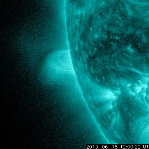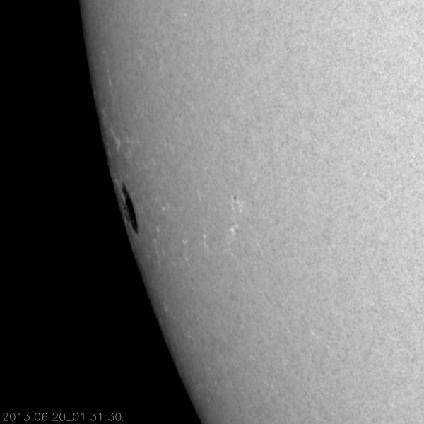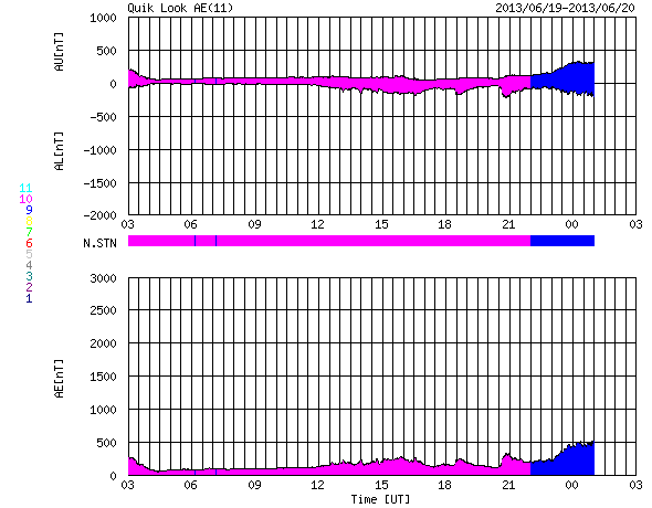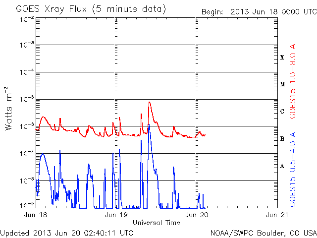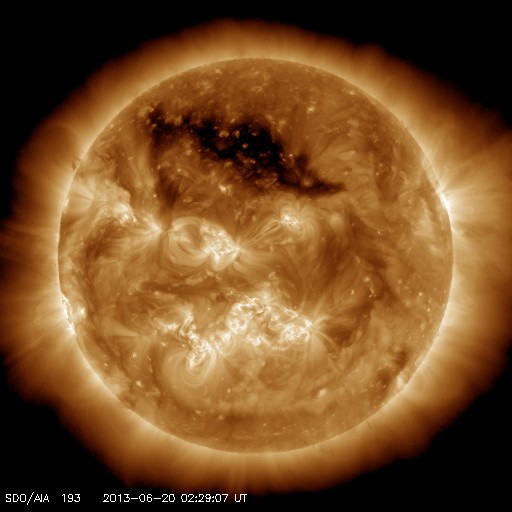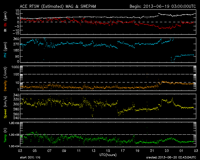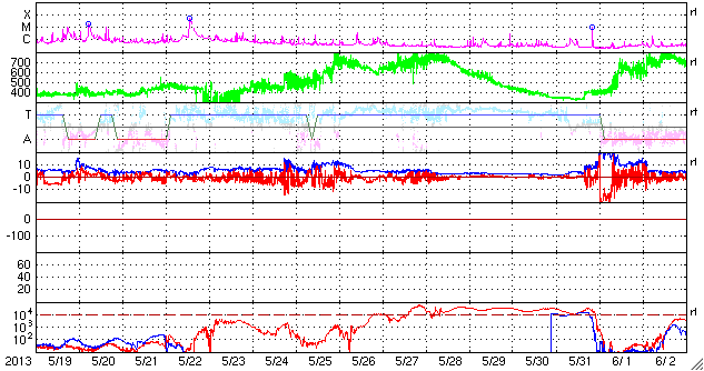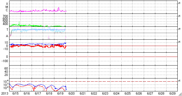 2013/ 6/20 11:44 更新 太陽の東端でC8.4のフレアが発生しました。太陽風は高速風が近づいているかもしれません。 担当 篠原 昨夕、19日18時半(世界時19日9時半)に、 C8.4と大きい小規模フレアが発生しました。 起きたのは太陽の東端の向こう側です。 SDO衛星AIA131によるフレアの様子をご覧ください。 前後に見えていたプロミネンスのループがきれいだったので、 時間を長くとって、たっぷり1日半の動画です。 この場所は、これまでもフレアの活動が見られて注目していましたが、 今日の可視光写真ではとうとう黒点が姿を現しています。 今後どのような活動を起こすのでしょうか。 太陽風は、また速度が下がって、 280km/秒と一段と遅い風になっています。 一方、磁場強度は、ずっと5nTで安定していましたが、 今朝くらいからゆっくりと高まり始め、 現在は9nTくらいに上がっています。 太陽の北半球に広がっているコロナホールの影響が 近づいているのかもしれません。 今日のSDO衛星AIA193を見ると、コロナホールの先頭(右端)は 太陽の西側に進んでいます。 もう少し時間がかかるかもしれませんが、 速度も上昇を始めるかもしれません。 前周期は700km/秒を超える高速風が到来した期間なので、 今後の変化に注目して下さい。 磁気圏は、比較的穏やかです。 AE指数のグラフでは、磁場の南向きに対応して、 弱い変化が発生している程度です。