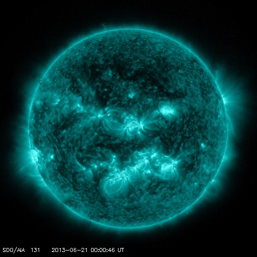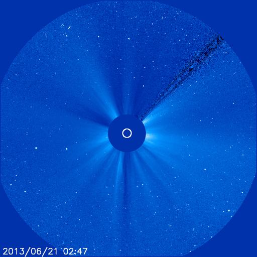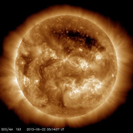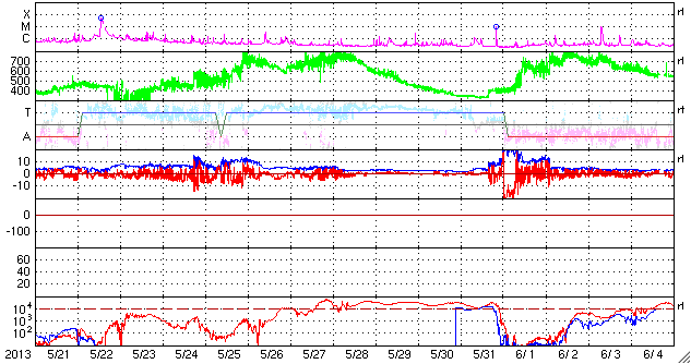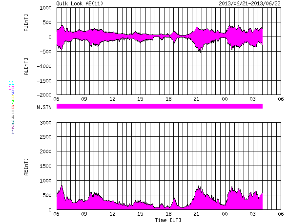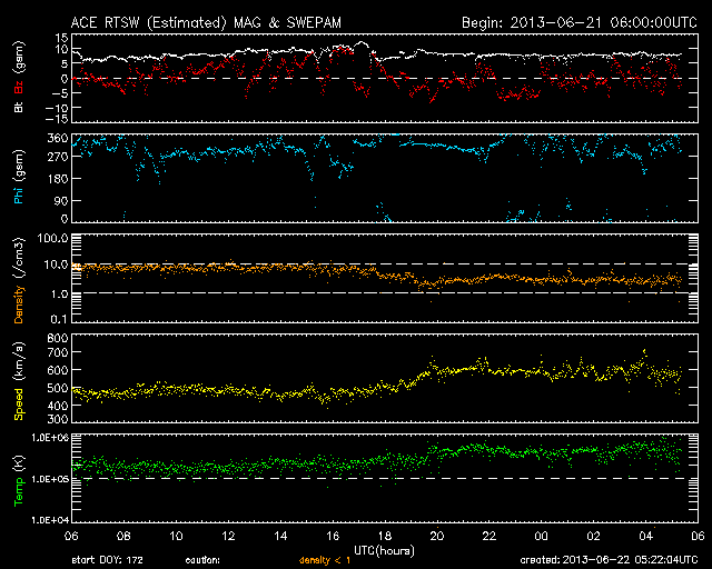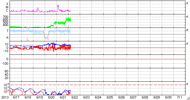 2013/ 6/22 14:22 更新 M2.9の中規模フレアが発生しました。太陽風の速度は600km/秒に上がっています。 担当 篠原 昨日のお昼、21日11時半(世界時21日2時半)、 ちょうどニュースを更新した頃に太陽の南東(左下)の1777黒点群で M2.9の中規模フレアが発生しました。 SDO衛星AIA193によるフレアの様子と、 AIA304による激しいプラズマの噴出を動画でご覧ください。 ガスの噴き出しはCMEとなり、 SOHO衛星LASCO C3で撮影されています。 太陽の南東方向を中心に噴出していますが、 広がりの様子から多少地球へも影響が到来するかもしれません。 3日後程度と考えると、明後日、24日頃の太陽風に注目して下さい。 太陽では、南西(右下)の1772黒点群の変化も目立っています。 可視光の拡大写真で昨日の様子と見比べて下さい。 C1程度と規模は小さいですが、フレアを6回ほど起こしています。 この後の変化にも注目して下さい。 太陽風は、今日の未明になって更に速度が上がり、 600km/秒の高速風になっています(ACEの図の黄色線)。 前周期の700km/秒には達していませんが、 今回もかなり高い速度に上がっています。 磁場強度(白線)は10nTから8nTと少しだけ下がりましたが、 依然、平均的な状態よりも強まっています。 前周期のように、高速風はもう一段の変化が見られるのかもしれません。 SDO衛星AIA193では、コロナホールは太陽の西側に中心が移動して、 そろそろ最も影響が強まる頃かもしれません。 磁気圏の活動も高まっています。 AE指数のグラフは、750nT程度の変動が数時間おきに発生しています。 太陽風磁場の南北成分(赤線)を見ると、 0nTよりもプラス側と、北寄りの傾向になっています。 このため、太陽風の磁場や速度が高まっている割に、 磁気圏の乱れ方は弱い印象です。 高速の太陽風は更に4日くらい続くかもしれません。 もう一段の速度上昇も考えられます。 また、放射線帯の高エネルギー電子の増加も これから発生するかもしれません。