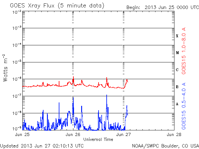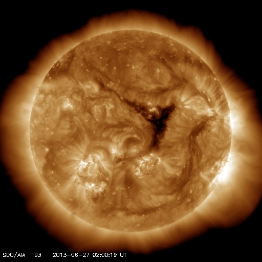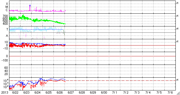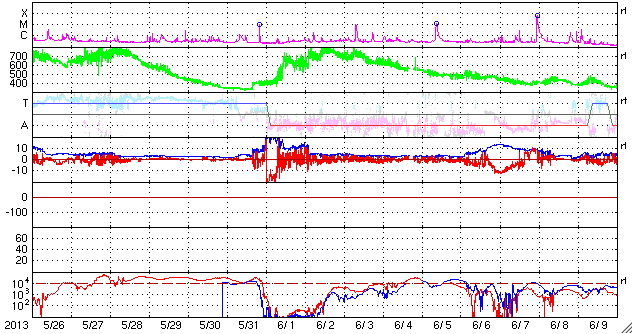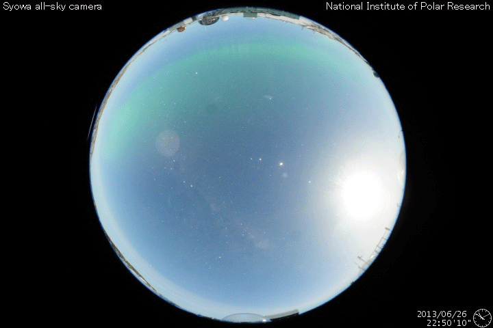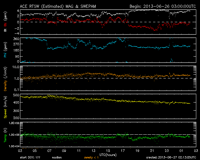 2013/ 6/27 11:14 更新 太陽風は平均的な速度に下がりました。次の高速風が近づいています。 担当 篠原 昨日は昭和基地の夕焼けを紹介したので、 今日はオーロラの動画です。 世界時26日23時(日本時間で今朝)の昭和基地の夜空です。 弱い活動ですが、月の明るい光に負けずに空を飾っています。 太陽風は、速度がどんどん下がって、 現在は400km/秒と平均的な状態に戻りました。 磁場強度は2〜4nTと弱いままなのですが、 昨日の午後から磁場の大まかな方向に変化が現れ、 セクターの切り替わりが近づいているようです。 27日周期の図のセクターのグラフでは、 「T」と「A」の中間で変化しています。 過去3周期にわたって、 このタイミングで「T」から「A」に切り替わっているので、 今回もこれから「A」に変わって行くのだと思います。 そして、その変化に関係しているのか、 太陽風磁場の南北成分が、振れ幅は小さいですが、 ACEの図の後半から南寄りの傾向になっています。 このため、AE指数も後半で小さな変化が発生しています。 最初に紹介した昭和基地のオーロラは、 この変化の頃に見られた現象です。 SDO衛星AIA193では、太陽の中心にあったコロナホールが、 西側に迫り出しています。 明日くらいに、地球へ高速風が到来するかもしれません。 27日前の前周期は700km/秒を超えるまで速度が高まりましたが、 今回はどの様な風になるでしょうか。 太陽は、C1の小さなフレアがあちこちで発生しています。 黒点はどれも小さく、太陽は現状程度の活動が見られる程度でしょう。 放射線帯の高エネルギー電子は、 今日も10,000を超えた状態で安定しています。 太陽風の乱れが到来するまで、高い状態が続きそうです。