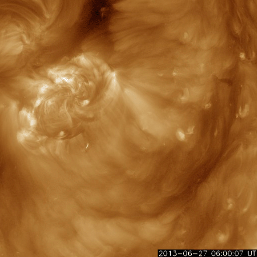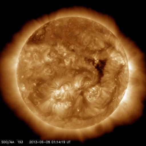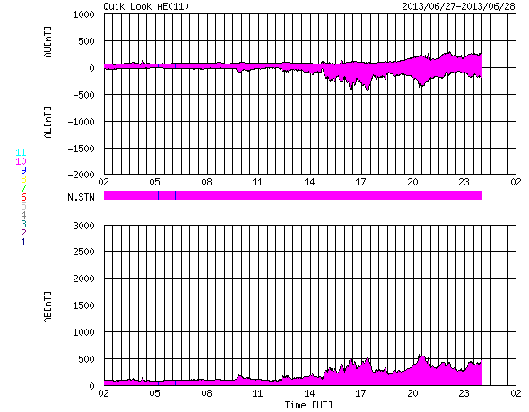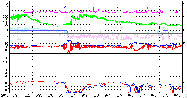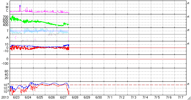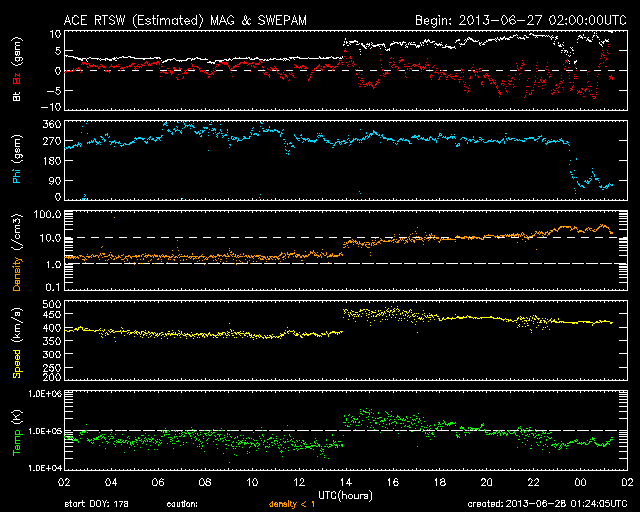 2013/ 6/28 10:25 更新 太陽風の弱い乱れが到来しました。高速風の到来はこれからです。 担当 篠原 昨夜、27日23時(世界時26日14時)に ACE衛星で小さい太陽風の乱れが観測されました。 速度が400km/秒から450km/秒に、磁場強度が4nTから7nTに、 プラズマの密度も2個/cm^3から10個/cm^3程度に急に上昇しています。 タイミングとしては、 23日に太陽で見られたCMEの影響かもしれませんが、よく分かりません。 興味深いことに、27日周期の図を見ると、 27日前5月31日にも良く似た小規模の太陽風の乱れが到来しています。 この時も原因がはっきりしなかったのですが、 ここの太陽風はこういう分布になっているのでしょうか。 その後の太陽風は、磁場強度は8nT前後で推移していますが、 速度は420km/秒に下がっています。 前周期の高速太陽風の到来を参考にすると、 太陽風の磁場はこれから更に強まり、 遅れて、今夜くらいから速度も上昇を始めるかもしれません。 この後のACEの変化に注目して下さい。 太陽風の乱れが到来した後、 太陽風磁場の南北成分は南向きに振れています。 このため、磁気圏の活動度が少し高まって、 AE指数は500nT程度の変化が続くようになっています。 太陽風の本格的な変化はこれからだと思われるので、 磁気圏の変動も今後一段と活発になる可能性があります。 また、太陽風の擾乱の影響で、 放射線帯の高エネルギー電子が大きく減少しています。 太陽では、1778黒点群が少し活動的で、 C1.2の小規模フレアを2回起こしています。 太陽のフレア活動は今後も現状程度でしょう。 太陽の中央から少し右下の領域でフィラメントの噴出が発生しました。 噴き上がる様子がSDO衛星できれいに見えていたので、 動画を掲載します。 ![]() SDO衛星AIA193と304による、フィラメント噴出の様子。 (c) SDO (NASA)、 (動画加工 : 宇宙天気ニュース) ![]() SDO衛星のAIA193カメラによる太陽コロナの様子 (c) SDO (NASA) ![]() SDO衛星による太陽の可視光写真。マウスの矢印を写真に重ねると、黒点番号付きの写真に切り替わります。 (c) SDO (NASA) ![]() ACEが観測した太陽風の磁場(1番上の枠、白線は全体の強度、赤線は南北成分) および、太陽風の密度(3番目の橙線)、速度(4番目の黄線) (c) NOAA/SWPC ![]() リアルタイムAE指数 下段のAEグラフの値が高くなると、オーロラ活動が活発化しています。 (c) 京都大学, NICT ![]() 27日の太陽周期に合わせたデータプロット 太陽が同じ面を地球に向けていた27日前の変化から、今後を予想することができます。 (c) 作図:宇宙天気ニュース