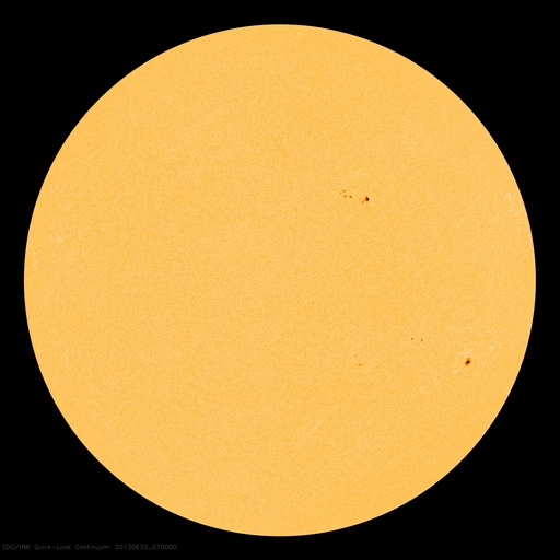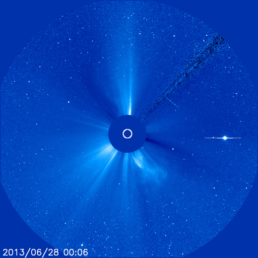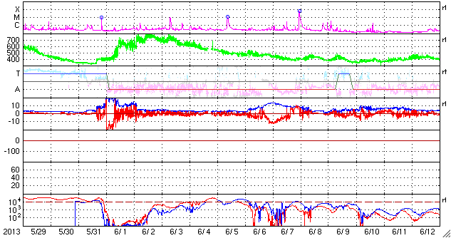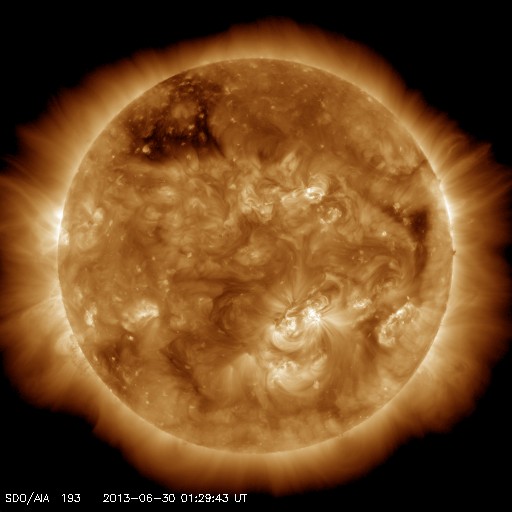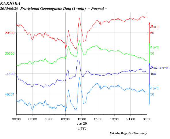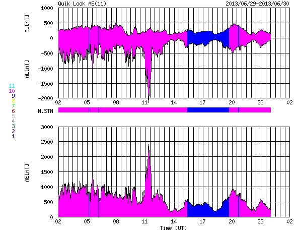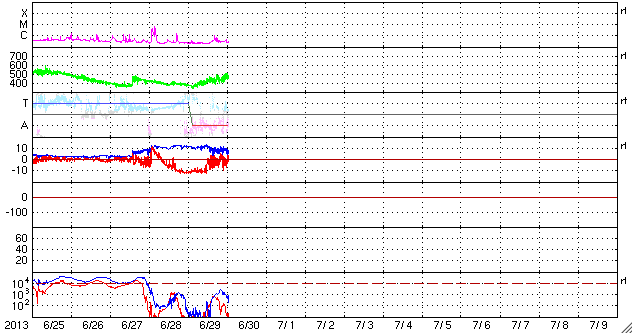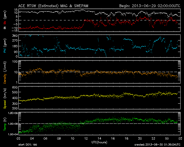2013/ 6/30 10:37 更新 太陽風磁場の強い南向きは終わりました。その後、速度が少し上がっています。 担当 篠原 -10nTに達する太陽風磁場の強い南向きは、ACE衛星では、 昨夜、29日21時(世界時29日12時)近くまで続きました (地球へ達したのは1時間後くらい)。 その後、磁場の南北成分は0〜-5nTで変動するようになり、 磁場の強度も12nTから7nTへ下がる傾向を見せています。 一方、速度は緩やかな上昇を示し、 470km/秒とやや高速の風になっています。 しかし、27日周期の図を見ると、 前周期の今頃は700km/秒に達するかなり高い速度に上がっていました。 それと比べると、 太陽風の速度変化はずいぶん小さくなってしまいました。 磁気圏の活動は、AE指数によると、 太陽風磁場が強く南を向いていた前半は、 1000nT規模の活発な変化が記録されています。 特に、29日20時(世界時20日11時)には、 2300nTに達する非常に大きな変化が発生しています。 激しいオーロラ爆発が発生した様です。 参考に日本の地磁気データ(茨城県の地磁気観測所)を見ると、 こちらでも世界時20日11時に大きな変動が観測されていました。 オーロラの様子が見られないのが残念です。 AE指数の後半は、磁場の振れが小さくなったので、 変化も小さくなっています。 SDO衛星AIA193を見ると、 コロナホールはすっかり西の端に近付いています。 今回はこのまま目立った影響は到来しないのかもしれません。 もうしばらくACEのデータに注目してください。 太陽は、1781黒点群でC1.1の小さなフレアが発生した程度で、 穏やかな状態です。 昨日お知らせした1777黒点群のC4.4フレアに伴って発生した CMEの様子を動画で紹介します。 南西(右下)方向を中心に白いガスが広がっています。 しかし、淡いですが太陽全体を囲むようにも広がっているので、 弱い影響が地球に到来する可能性があります。 NOAA/SWPCのシミュレーションの図を掲載します。 昨夜の様子ですが、太陽(中心の黄色丸)から 右上に向かってガスのかたまりが飛び出していて、 その端が地球(右側の緑色丸)にかかりそうです。 到来まで3日前後と考えると、 今夜から明日くらいに太陽風に小規模の乱れが見られるかもしれません。