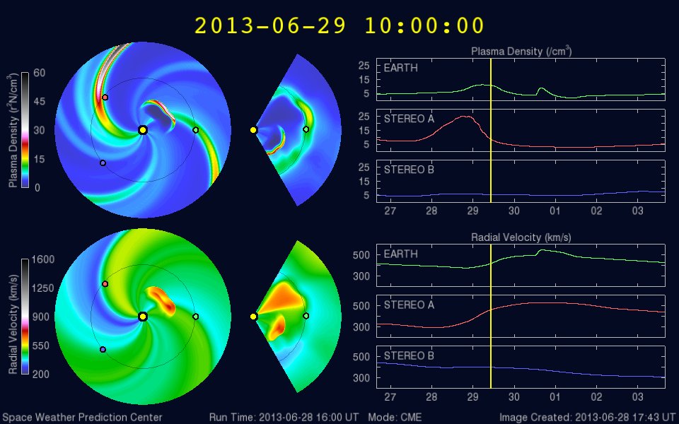 (c) 気象庁地磁気観測所 ![]() SOHO衛星LASCO C3による、昨日のC4.4フレアに伴うCMEの噴出。 (c) SOHO (ESA & NASA)、(動画加工 : 宇宙天気ニュース) ![]() 太陽風シミュレーションによる、CMEが噴き出している様子。29日19時(世界時29日10時) (c) NOAA/SWPC ![]() SDO衛星のAIA193カメラによる太陽コロナの様子 (c) SDO (NASA) ![]() SDO衛星による太陽の可視光写真。マウスの矢印を写真に重ねると、黒点番号付きの写真に切り替わります。 (c) SDO (NASA) ![]() ACEが観測した太陽風の磁場(1番上の枠、白線は全体の強度、赤線は南北成分) および、太陽風の密度(3番目の橙線)、速度(4番目の黄線) (c) NOAA/SWPC ![]() リアルタイムAE指数 下段のAEグラフの値が高くなると、オーロラ活動が活発化しています。 (c) 京都大学, NICT ![]() 27日の太陽周期に合わせたデータプロット 太陽が同じ面を地球に向けていた27日前の変化から、今後を予想することができます。 (c) 作図:宇宙天気ニュース