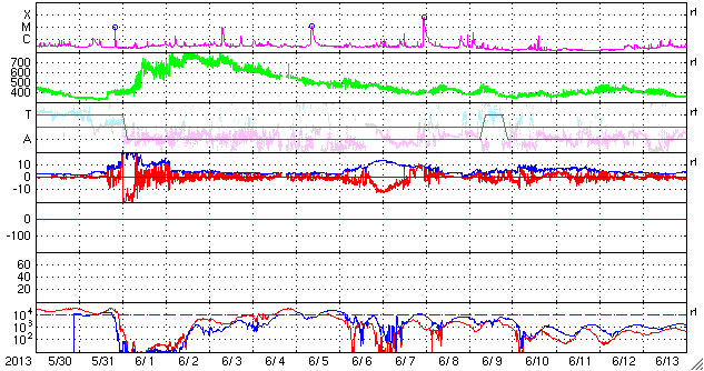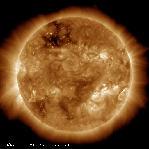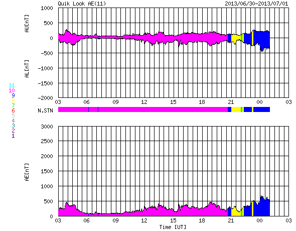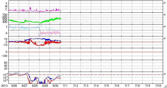 2013/ 7/ 1 11:32 更新 太陽風の速度が500km/秒台に上がっています。C1〜2の小さいフレアが続いています。 担当 篠原 太陽風の速度は、昨日の470km/秒からもう一段上がって、 540km/秒の高速風になっています。 コロナホールの影響が強まったのか、 判断しずらいですが、 CMEの変化も混じっているのかもしれません。 磁場強度は5nTでほぼ安定しています。 南北成分は、振れ幅は小さいですが南寄りの傾向です。 このため、磁気圏では小規模の変化が続いていて、 AE指数は300〜500nT程度の小規模の変化が続いています。 SDO衛星AIA193の写真では、 太陽の西に見えていたコロナホールは、 かなり端に近付いています。 ここからの影響も終わりに近づいているでしょう。 今後の太陽風は、速度が次第に低下して、 穏やかな状態に戻るでしょう。 太陽では、C2.7を最大として、 1780黒点群と1778黒点群(ほとんど見えなくなっています)で、 C1〜2の小規模フレアが5回発生しています。 活動が増えていますが、黒点の規模は小さいので、 現状程度の活動が見られるくらいでしょう。 昨日、一昨日のニュースでお知らせした、 28日、29日の磁気圏の活発な活動によって、 各地できれいなオーロラが観測されています。 Spceweather.comのオーロラギャラリーなどで、 様々な写真を見ることができます。 また、ニュージーランド南島のオーロラ写真も公開されていると 個人的に教えていただきました。 (直接アドレスを紹介してよいか分かりませんので、 Googleなどで "flickr aurora nz"などと検索してみて下さい) 地球は、北も南もにぎやかだった様です。
