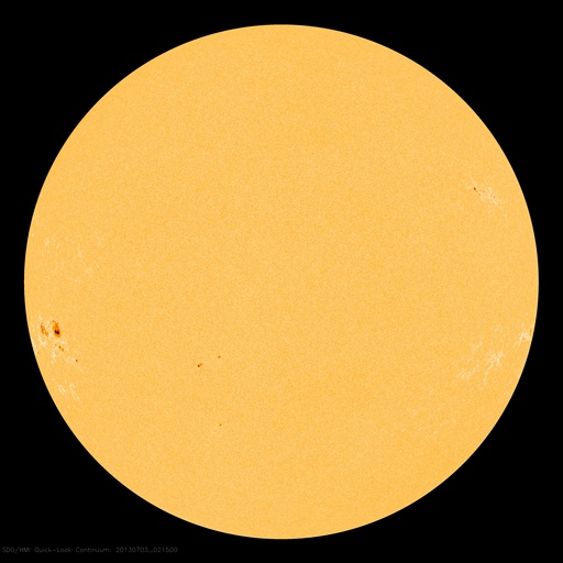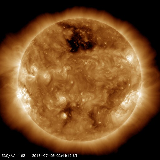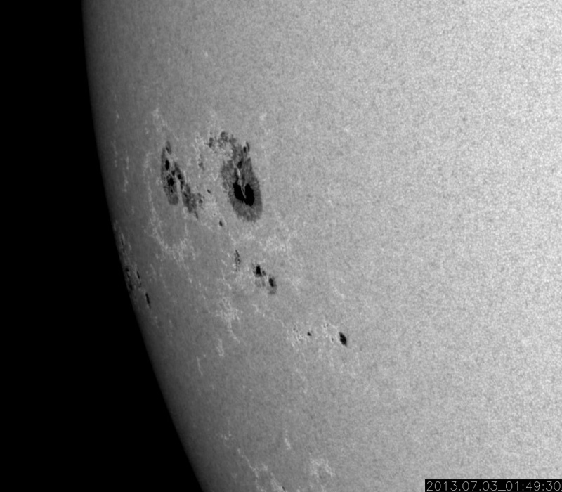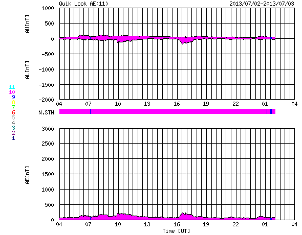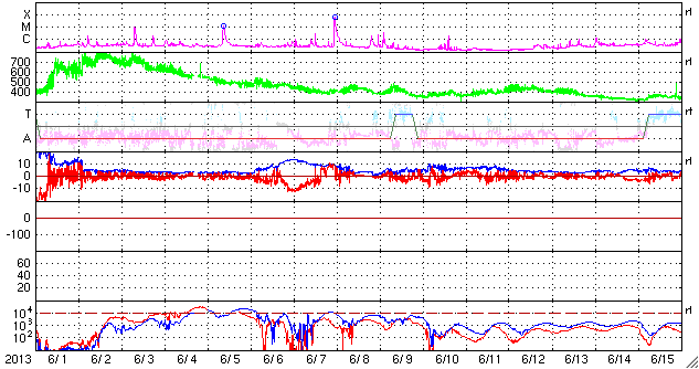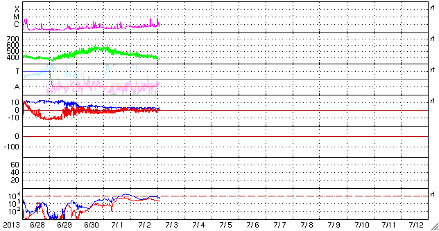 2013/ 7/ 3 12:01 更新 C7の小規模フレアが2回発生しました。太陽風はやや低速で穏やかです。 担当 篠原 昨日、太陽の東端から姿を現した1785黒点群は、 さらにその続きがあり、今日は一段と大きな姿を見せています。 SDO衛星の可視光カメラによる拡大写真を掲載します。 そして、この1785黒点群で、 今日の未明、3日3時(世界時2日18時)にC7.1、 今朝、3日9時(世界時3日0時)にC7.2と、 大きめのCクラスフレアが連続で発生しています。 この後も活動的な状態が続く可能性があります。 引き続き注目して下さい。 また、昨日の朝の現象ですが、 太陽の東端でフィラメント噴出が発生していました。 SDO衛星AIA304による噴き上がりの様子と、 その後のCMEをSOHO衛星LASCO C3の動画でご覧ください。 巨大なプラズマのアーチが豪快に太陽の左に飛び出しています。 地球からは横方向に噴出しているので、影響はないでしょう。 太陽風は、昨日のニュース以降もゆっくりと速度が下がり、 現在は380km/秒とやや低速の状態になっています。 磁場強度は3nTと弱めです。 南北成分は0nTをはさんで、南北に振れていますが、 元々の強度が弱いため、振れ幅は小さく、 +2nTと-2nTの間を変化している程度です。 このため、磁気圏の活動は起きているものの小規模で、 AE指数は200nTの小さい変化をしています。 SDO衛星AIA193の太陽コロナ写真を見ると、 太陽の北半球の高緯度域に大きなコロナホールが広がっています。 緯度が高いので、地球への影響は及びにくいと思われますが、 今後の太陽風はどうなるでしょうか。 放射線帯の高エネルギー電子は、高い状態が続いていますが、 10,000のラインは割っています。 ![]() SDO衛星の可視光写真による、東の端に大きな姿を現した1785黒点群。 (c) SDO (NASA) ![]() GOES-15衛星のX線カメラによるC7.1とC7.2フレア。 (c) NOAA/SWPC 、(動画加工 : 宇宙天気ニュース) ![]() 昨日の朝、太陽の東端からフィラメント噴出が発生し、CMEが飛び出しています。 (c) SDO (NASA)、SOHO (ESA & NASA)、 (動画加工 : 宇宙天気ニュース) ![]() SDO衛星のAIA193カメラによる太陽コロナの様子 (c) SDO (NASA) ![]() SDO衛星による太陽の可視光写真。マウスの矢印を写真に重ねると、黒点番号付きの写真に切り替わります。 (c) SDO (NASA) ![]() GOES衛星の太陽X線データ (c) NOAA/SWPC ![]() ACEが観測した太陽風の磁場(1番上の枠、白線は全体の強度、赤線は南北成分) および、太陽風の密度(3番目の橙線)、速度(4番目の黄線) (c) NOAA/SWPC ![]() リアルタイムAE指数 下段のAEグラフの値が高くなると、オーロラ活動が活発化しています。 (c) 京都大学, NICT ![]() 27日の太陽周期に合わせたデータプロット 太陽が同じ面を地球に向けていた27日前の変化から、今後を予想することができます。 (c) 作図:宇宙天気ニュース