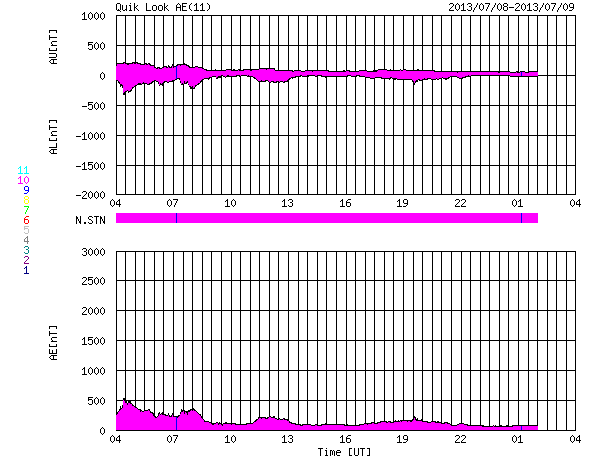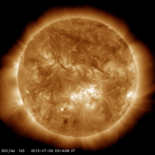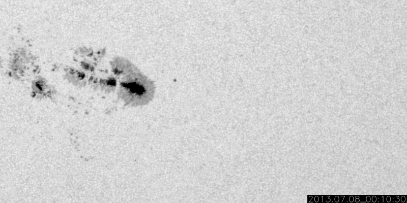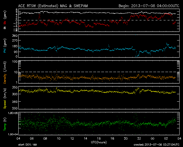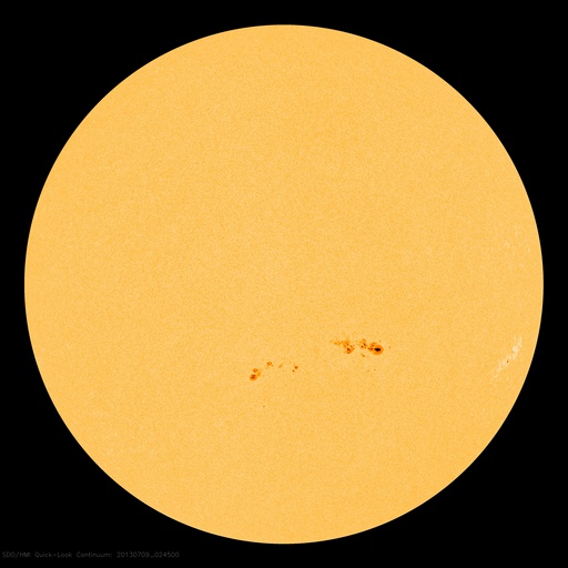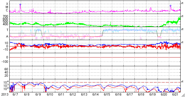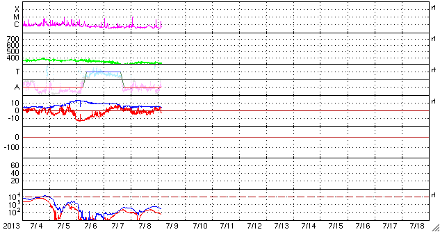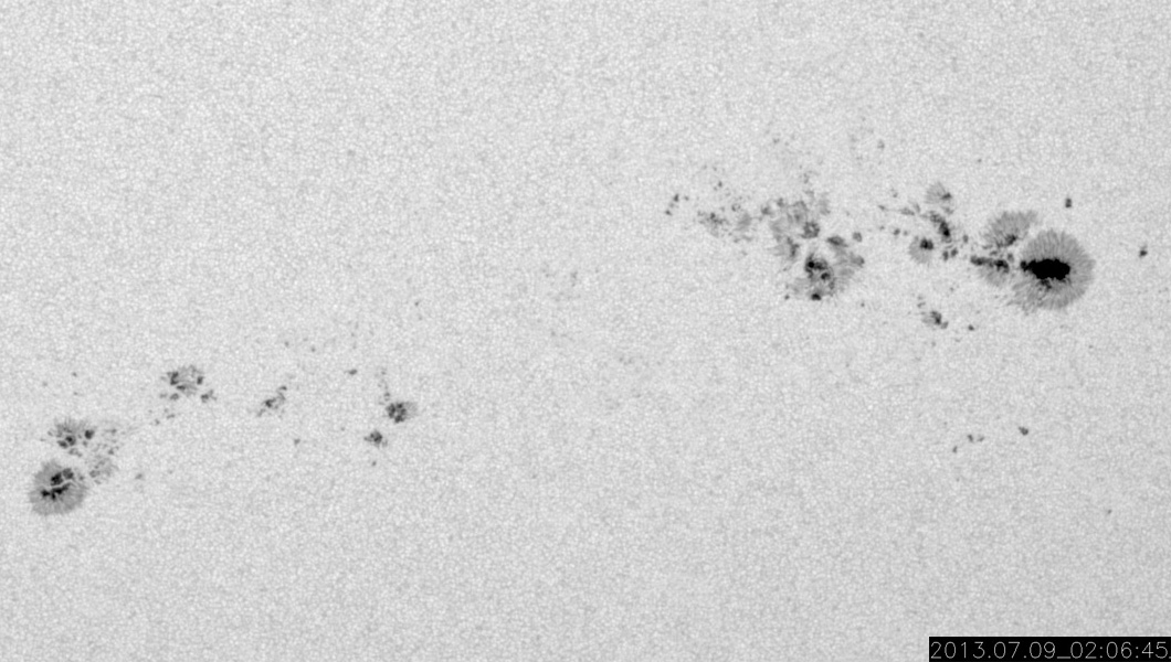 2013/ 7/ 9 12:27 更新 Cクラスのフレアが続いています。太陽風は低速で磁気圏も穏やかです。 担当 篠原 1785、1787黒点群は、大きな姿を保っていますが、 1枚目の拡大写真を昨日の写真と比較すると、 少し小さくなっている印象も受けます。 右側の1985黒点群について、 昨日から今日にかけての拡大写真の動画を掲載します。 ゆっくりとした動きですが、黒い暗部や灰色の半暗部など、 あちこちで興味深い動きを見ることができます。 発生頻度は減りましたが、Cクラスのフレアも続いていて、 昨日のニュースの更新時に発生したC9.7に続いて、 C4.5やC2.8が発生しています。 黒点群は、このまま穏やかになっていくのか、 再び活動を高めるのか、もうしばらく注目して下さい。 太陽風は、320km/秒前後と低速の風が続いています。 磁場強度は5nTと平均的な強さで安定していて、 磁場の南北成分は、グラフの前半で弱い南寄り、 その後弱い北寄りに変わっています。 AE指数のグラフもこの変化に合わせて、 前半に小規模の山が見られ、後半は変化がなくなっています。 SDO衛星AIA193の太陽コロナ写真を見ると、 コロナホールはなく、 太陽風はこの後も低速の穏やかな状態が続くと思われます。 27日周期の図を見ると、 前周期の最後の6月21日に速度の上昇が起きています。 この高速風が回帰すると考えると、7月18日頃となりそうです。 ![]() 太陽の中央部に広がる、1785、1787黒点群 (c) SDO (NASA) ![]() SDO衛星の可視光写真による、1785黒点群の1日の変化。 (c) SDO (NASA)、 (動画加工 : 宇宙天気ニュース) ![]() SDO衛星のAIA193カメラによる太陽コロナの様子 (c) SDO (NASA) ![]() SDO衛星による太陽の可視光写真。マウスの矢印を写真に重ねると、黒点番号付きの写真に切り替わります。 (c) SDO (NASA) ![]() GOES衛星の太陽X線データ (c) NOAA/SWPC ![]() ACEが観測した太陽風の磁場(1番上の枠、白線は全体の強度、赤線は南北成分) および、太陽風の密度(3番目の橙線)、速度(4番目の黄線) (c) NOAA/SWPC ![]() リアルタイムAE指数 下段のAEグラフの値が高くなると、オーロラ活動が活発化しています。 (c) 京都大学, NICT ![]() 27日の太陽周期に合わせたデータプロット 太陽が同じ面を地球に向けていた27日前の変化から、今後を予想することができます。 (c) 作図:宇宙天気ニュース