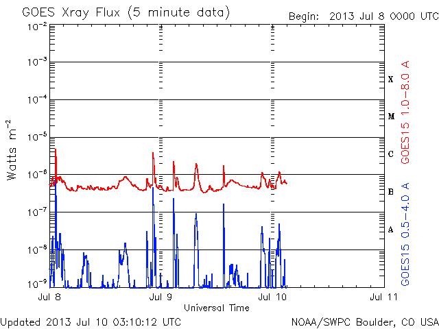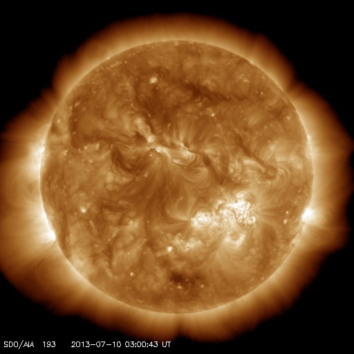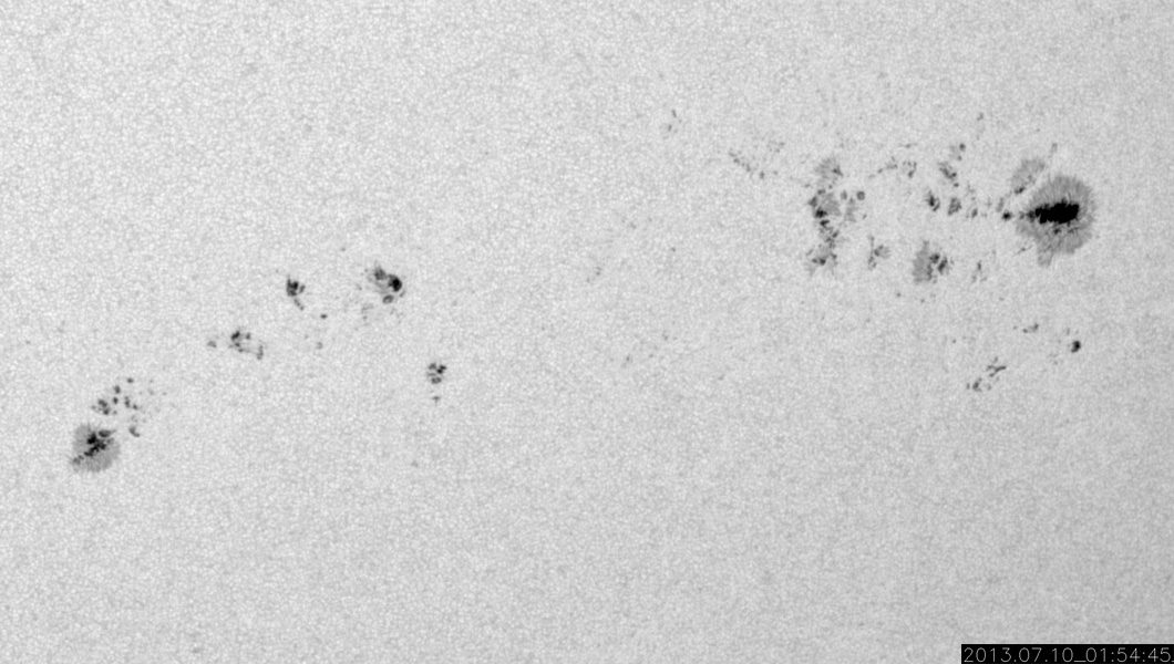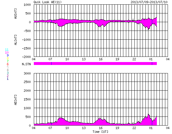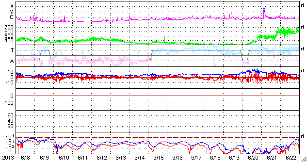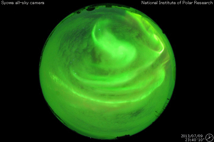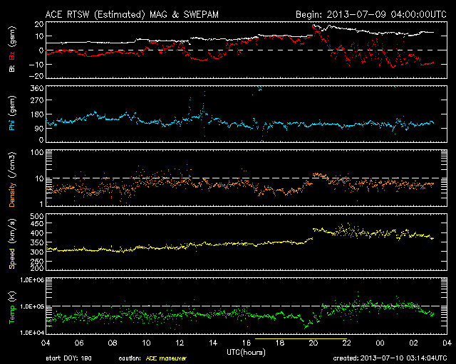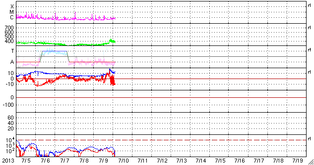 2013/ 7/10 12:12 更新 太陽風磁場が強まり、南向きに振れています。磁気圏の活動もやや強まりそうです。 担当 篠原 太陽の1785、1787黒点群は、規模の縮小が続いているようで、 今日の写真では、また少し小さくなった様に見えます。 小規模のフレアの発生は続いていて、 C2.0、C2.3、C1.3などが1785、1787黒点群で発生しています。 また、太陽の北半球の中緯度域で、 9日23時(世界時9日14時)にフィラメント噴出が発生しています。 SDO衛星AIA193による動画を掲載します。 そして、噴き上がった後のCMEの様子を、 STEREO Behind衛星のCOR2カメラが捉えています。 地球のある右に向かって、白いガスが噴き上がっています。 太陽の中心付近で発生していることから、 CMEによる太陽風の乱れは地球に到来する可能性があります。 13〜14日あたりの太陽風に弱い乱れが見られるかもしれません。 太陽風は、速度が300km/秒から350km/秒に少し上がっていますが、 低速の状態は続いています。 磁場強度が5nTから12nTくらいに強まっていて、 南北成分の振れも大きくなっています。 現在は-10nTと南に大きく振れていて、この状態が続くと、 磁気圏の活動もある程度大きくなりそうです。 (現在のAE指数は、500nTくらいの変化です) 磁場の南向きが強まり始めた頃、 世界時9日23時の昭和基地のオーロラの動画を掲載します。 オーロラの明るい光が、激しく空で踊っています。 この時間帯も10秒間隔の撮影だったので、 よりなめらかにオーロラの動きを捉えています。 この後も、低速の太陽風が続くと思われますが、 磁場の南向きの変化に注目して下さい。