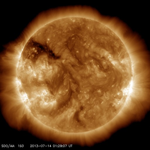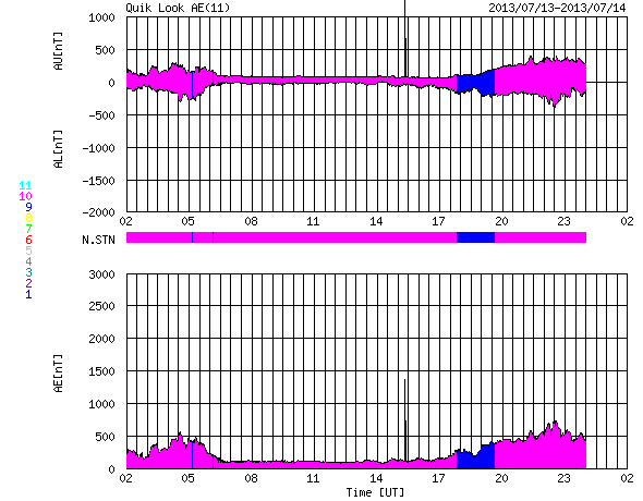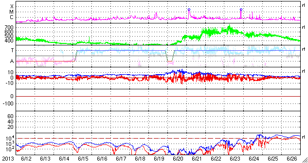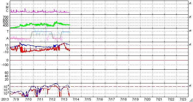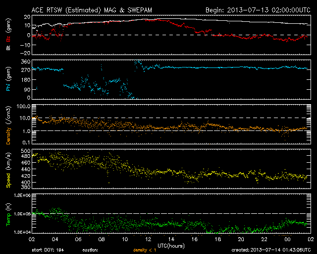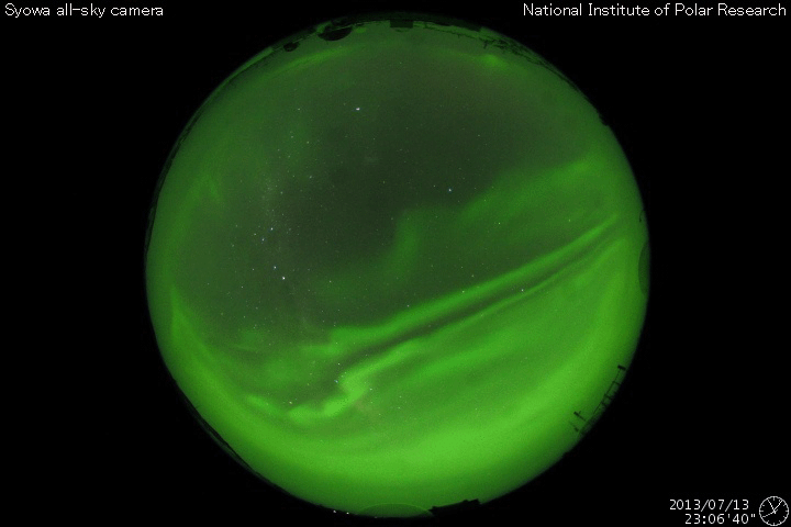 2013/ 7/14 10:43 更新 太陽風磁場が大きく強まりましたが、北向きに振れたため磁気圏への影響は限定的です。 担当 篠原 昨日のニュースでお知らせした太陽風磁場の強まりは、 その後更に強まって、 13日13時(世界時13日22時)には17nTまで高まりました。 その後はゆっくりと低下して、現在は10nTにまで下がりましたが、 依然、通常よりも大きく強まった状態です。 注目していた磁場の南北成分は、 磁場が強まる時間帯は、北向きに振れました。 最高で+15nTくらいにまで高まっています。 その後、磁場強度が弱まり始めると、0nT付近に下がり、 以降は、-3〜-5nTと特に大きくはありませんが、南向きに変わっています。 このため、磁気圏の活動は、 AE指数のグラフを見ると、磁場が北向きだった前半は静かで、 南向きに変わった後半はやや活動的に変わっています。 前半の強い北向きが、反対の南向きだったら、 激しい磁気圏の擾乱が発生していたでしょう。 オーロラ観望としては、ちょっと残念な結果でした。 それでも、後半の活動的な時間帯に、 南極の昭和基地できれいなオーロラが撮影されています。 その様子を動画で紹介します。 オーロラの明るい光の帯や、大きな光の波が、 次々に写真の左から右に(空の上では東から西に)向かって流れていきます。 その様子に注目して下さい。 太陽風の速度は、480km/秒から420km/秒へ下がり、 一足先に通常の状態に戻っています。 磁場の乱れも、今日いっぱいくらいで終わるのではないでしょうか。 太陽は、1785黒点群は西に沈んでしまい、 現在目立っているのは、南東の1791黒点群です。 フレアの活動は、この1791群でC1が1回発生した程度で、 落ち着いています。 放射線帯の高エネルギー電子は、昨日よりは下がりましたが、 現在もGOES15(青線)が10,000を超える高い状態です。 ![]() 南極の昭和基地で全天カメラにより撮影された、世界時7月13日23時頃のオーロラ。 (c) 国立極地研究所、(動画加工 : 宇宙天気ニュース) ![]() SDO衛星のAIA193カメラによる太陽コロナの様子 (c) SDO (NASA) ![]() SDO衛星による太陽の可視光写真。マウスの矢印を写真に重ねると、黒点番号付きの写真に切り替わります。 (c) SDO (NASA) ![]() ACEが観測した太陽風の磁場(1番上の枠、白線は全体の強度、赤線は南北成分) および、太陽風の密度(3番目の橙線)、速度(4番目の黄線) (c) NOAA/SWPC ![]() リアルタイムAE指数 下段のAEグラフの値が高くなると、オーロラ活動が活発化しています。 (c) 京都大学, NICT ![]() 27日の太陽周期に合わせたデータプロット 太陽が同じ面を地球に向けていた27日前の変化から、今後を予想することができます。 (c) 作図:宇宙天気ニュース