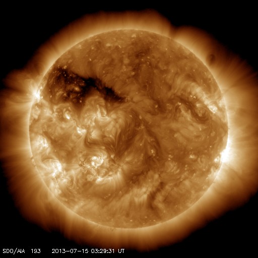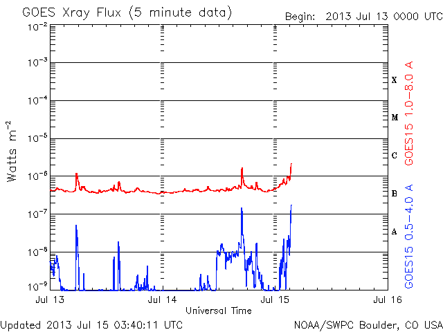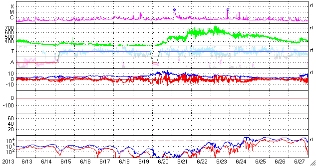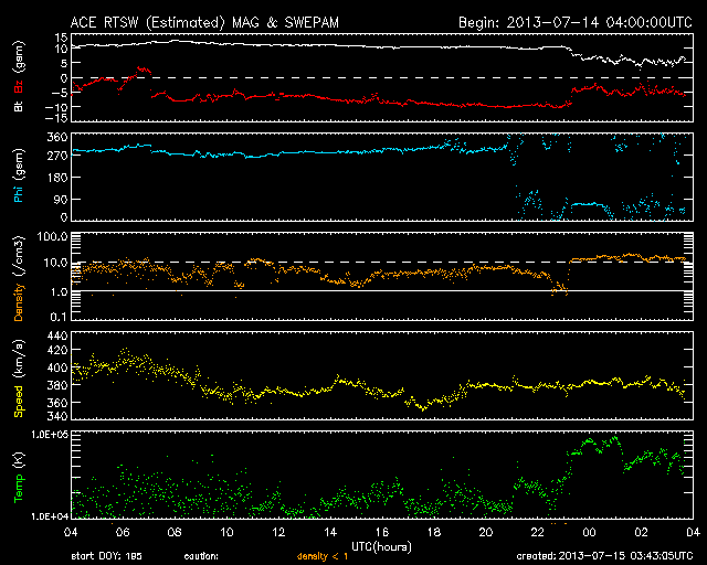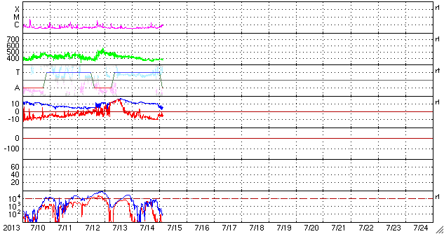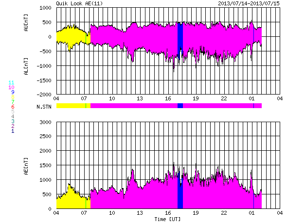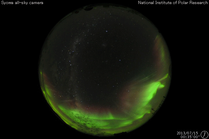 2013/ 7/15 12:44 更新 太陽風磁場の南向きが強まり、磁気圏活動も活発になりました。擾乱は終わりつつあります。 担当 篠原 昨日のニュースで注目していた様に、 昨日の午後、14日16時(世界時14日7時)頃から、 太陽風磁場の南北成分は大きく南向きに振れ、 磁気圏の活動度が高まりました。 太陽風に流されてきた磁場の変化の後半がやって来た様です。 太陽風の磁場強度は、 昨日のニュース以降も10nTを超えるレベルで推移しました。 南北成分は、最初に-7nT程度に南向きに振れて、 その後-10nTにまで強まっています。 この強い南向き磁場の影響で、磁気圏の活動度が高まり、 昨日は静かだったAE指数のグラフは、 今日のグラフの中盤から1000〜1500nTに達する 激しい変化を記録しています。 このグラフの最後の頃の大きな山である、 世界時15日1時のオーロラの様子を、 南極の昭和基地の全天カメラの動画で紹介します。 10秒間隔の写真なので、 オーロラの動きはより細かく撮影されています。 緑色の光の乱舞が見事です。 その上空には赤いオーロラの帯もよく見えています。 この間、太陽風の速度は400km/秒から380km/秒と 平均的な値で安定していました。 磁場強度も、今朝から強度が一段下がって、 現在は5nTと通常の値です。 南北成分の南向きは続いていますが、 磁気圏活動の規模は小さくなって行くでしょう。 太陽は、東の端から新しい黒点が現われています。 ちょうど今、C2のフレアが発生した程度で、活動は穏やかです。 放射線帯の高エネルギー電子は、 磁気圏の活動の強まりの影響で減少しています。 明日以降、どのくらいのレベルで安定するでしょうか。