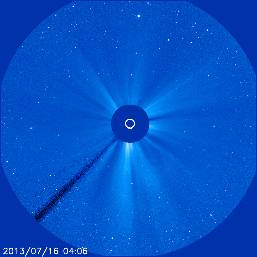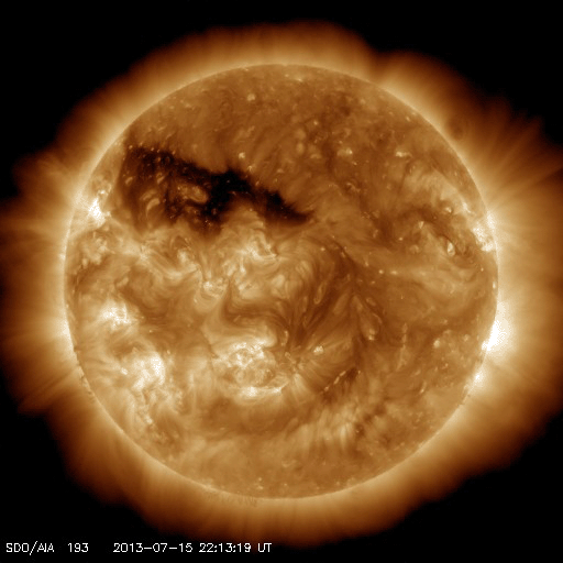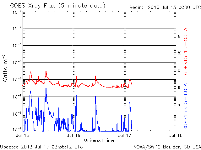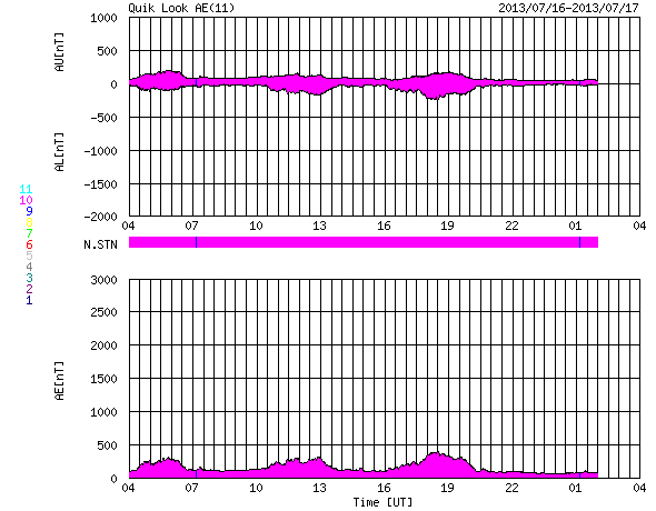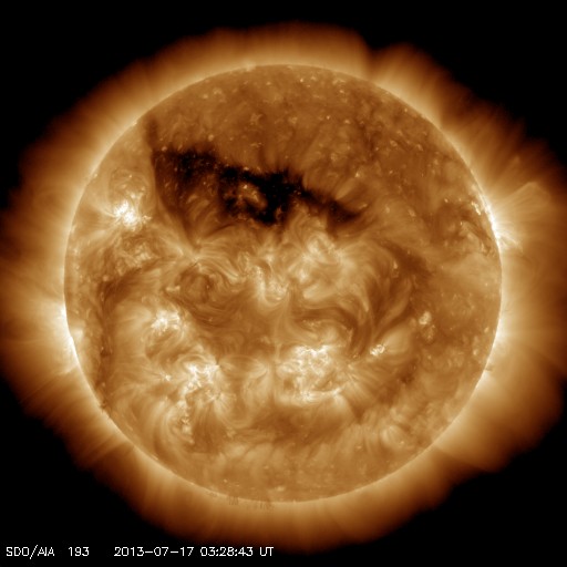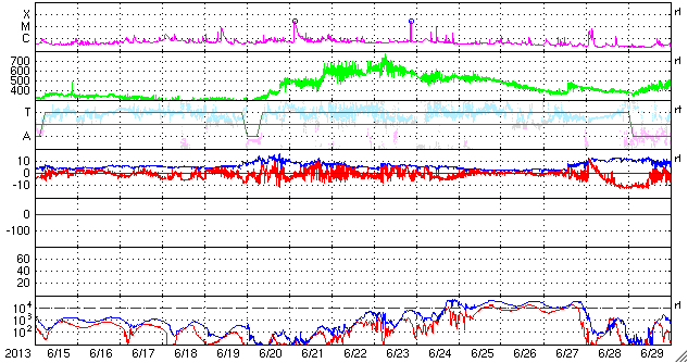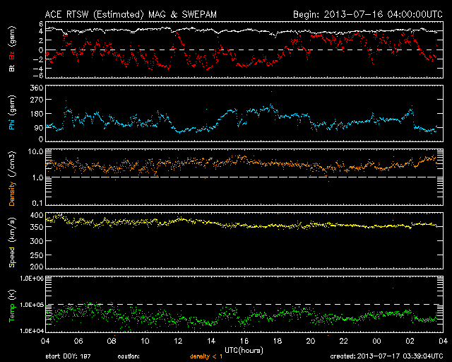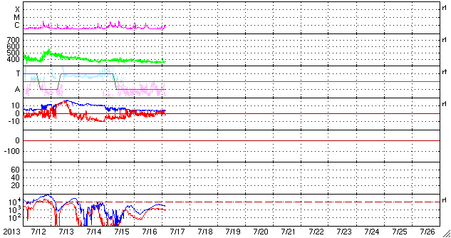 2013/ 7/17 12:39 更新 コロナホールによる太陽風の乱れが近づいています。 担当 篠原 16日11時(世界時16日2時)頃、太陽の中央から少し東(左)の領域で、 小規模の爆発現象が発生しています。 SDO衛星AIA193の動画を掲載します。 比較的広い範囲に、急にコロナの乱れが広がっています。 この現象に伴って、CME(太陽ガスの放出現象)も発生しています。 SOHO衛星LASCO C3の動画を見ると、 太陽の下半分に広がるように、淡いガスの噴き出しが起きています。 (この動画では太陽の右上にもガスのかたまりが噴き出していますが、 これは別の現象によるものです) この変動は太陽の中心付近で起きているので、 CMEの影響は地球方向にも噴き出している可能性があります。 地球まで3〜4日程度かかると見積もると、 19〜20日くらいに太陽風の乱れとして到来するかもしれません。 強い磁場のかたまりがやって来て、南向きに大きく振れた場合、 磁気圏の活発な活動を起こす可能性があります。 太陽では、この他にはC1〜2程度の小さなフレアが発生した程度です。 黒点はぽつぽつとありますが、それほど活動的ではありません。 太陽風は、速度は350km/秒に下がり、 より低速の風になっています。 磁場強度は4nTで安定しています。 磁場の南北成分は、0nTをはさんで 南に向いたり、北に向いたりしています。 このため、AE指数では弱い変化が時間をおいて発生しています。 SDO衛星AIA193の太陽コロナ写真を見ると、 北半球に広がるコロナホールは、太陽の中心線をまたぐ所まで来ています。 現在、ここから吹きだしている速度の高い太陽風が 地球に向かっていると思われます。 この後の太陽風の変化に注目して下さい。